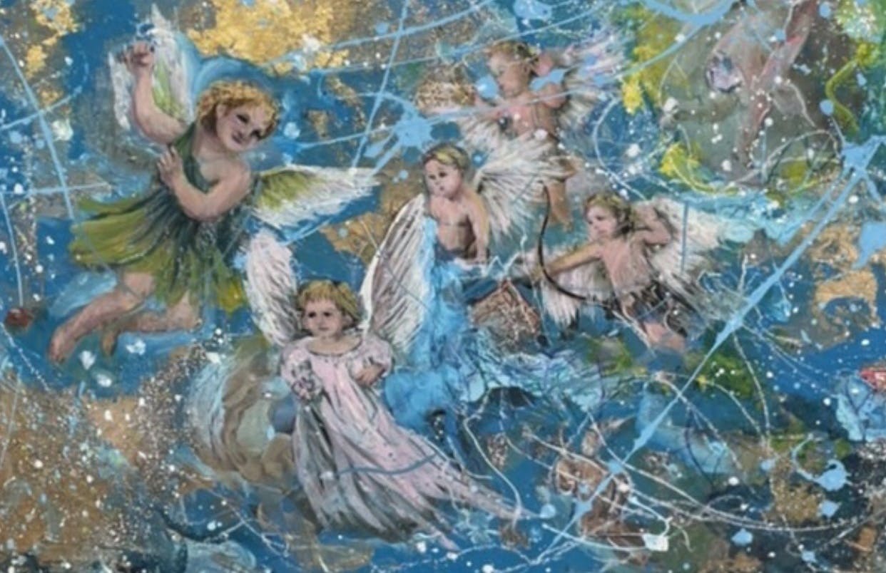 混沌の中央から、女神と天使が姿を現す。誰も見たことがない神秘的な一瞬の光景を、番は絵画に定着させた。女神が、天使が、番にこの絵を描かせた。ほかに説明のしようがない、未知のエネルギーを感じる作品だ。