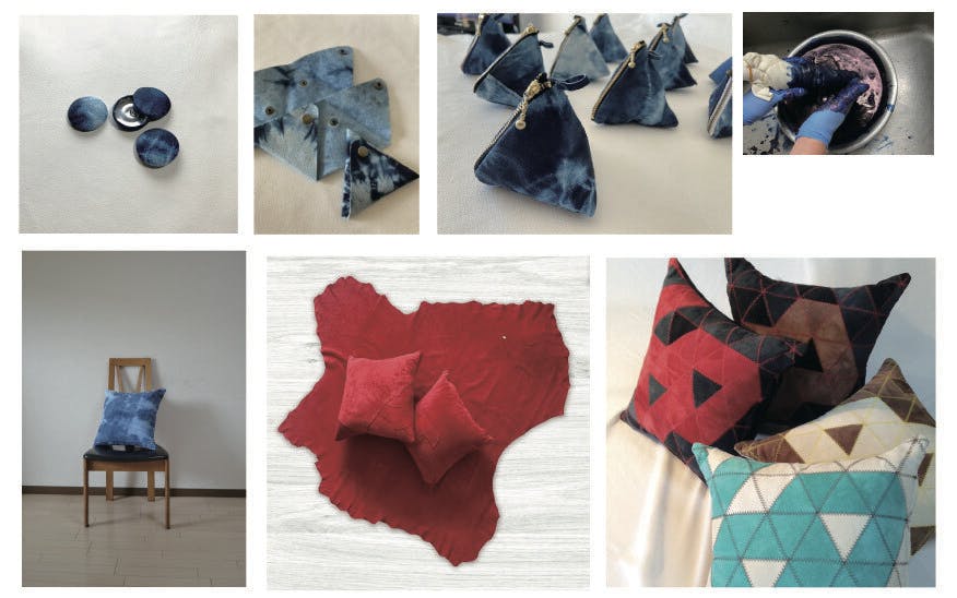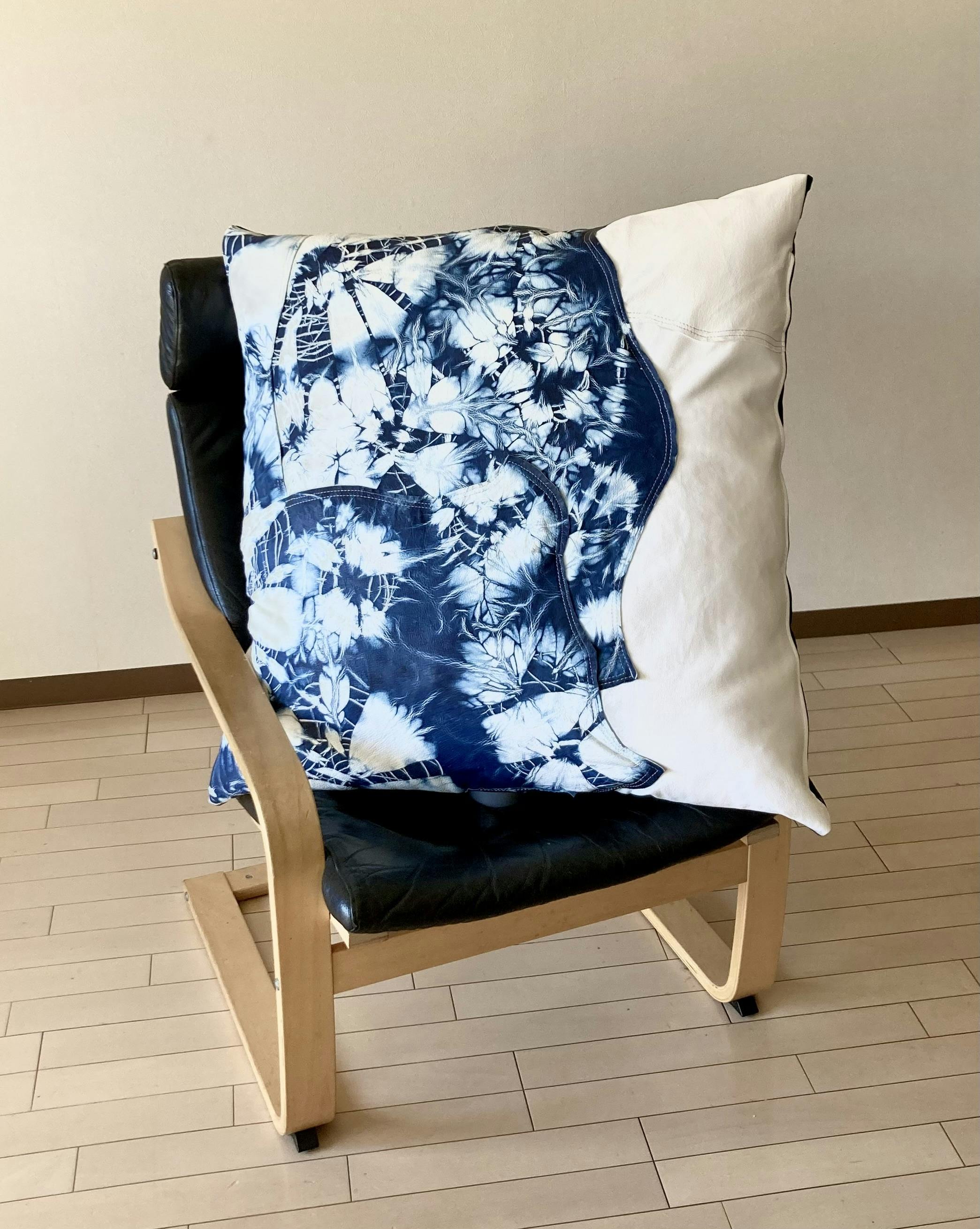 大きな一枚革では使っていくうちに伸びて変形してしまうことも。コラージュのように何枚かを重ねてレイアウトすることでより丈夫で、長く使っていただけるようなクッションになりました。