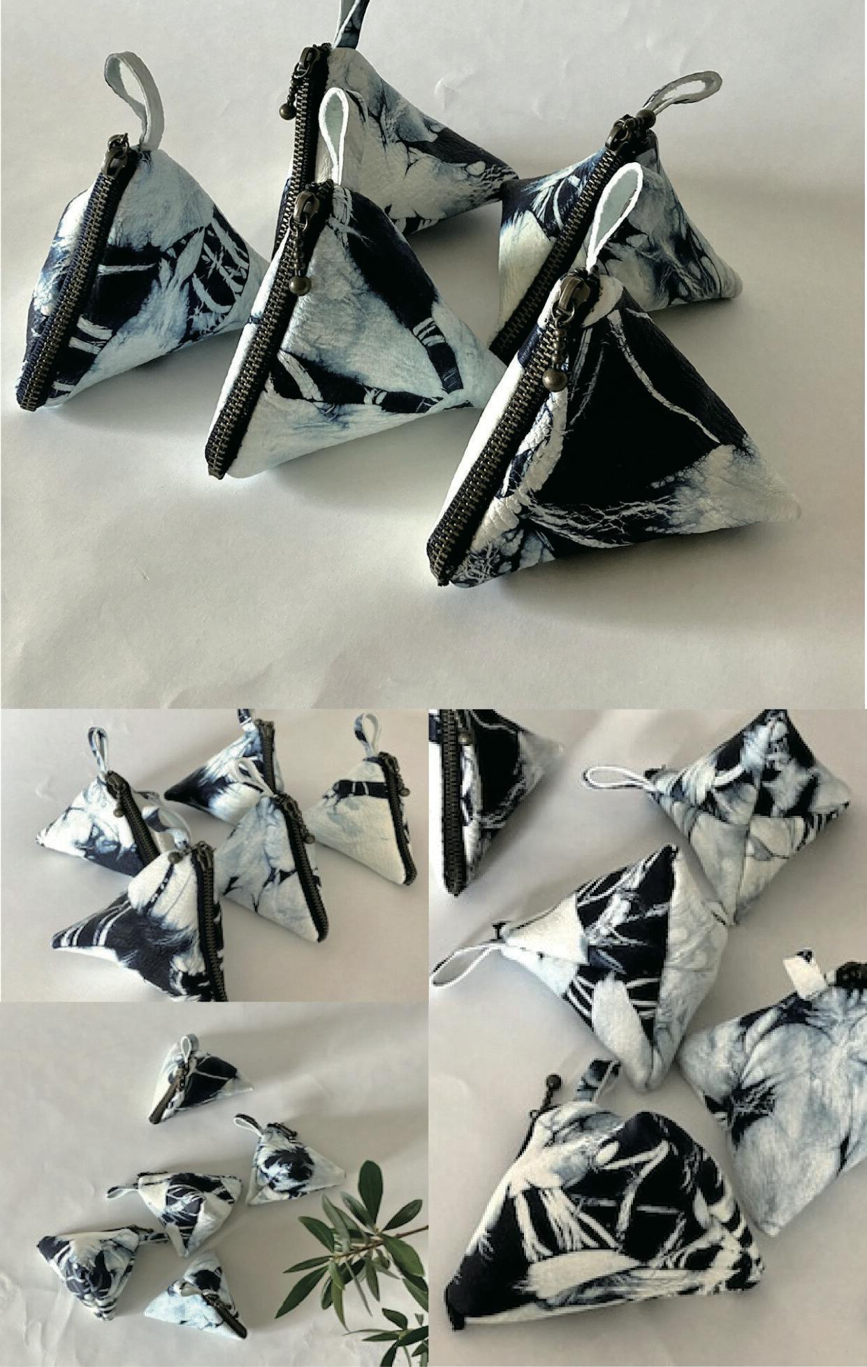鹿革藍染絞りの一辺が10cmのおむすび型三角ポーチ