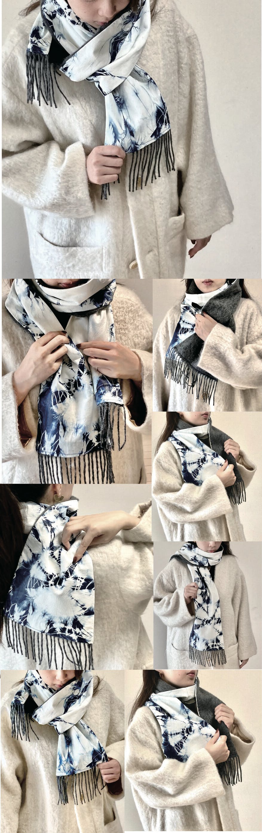 表面は藍染の鹿革、裏面はグレーもしくはホワイトのカシミヤなので、リバーシブルにお使いいただけます。