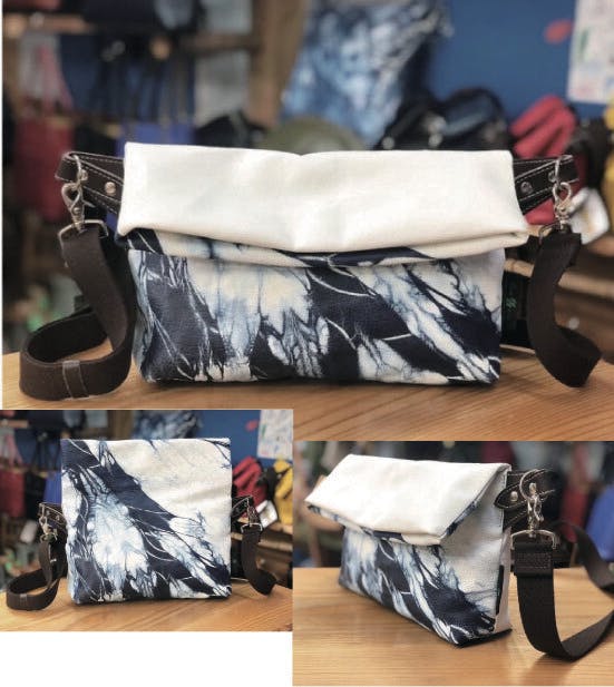 バッグの口が滑らかな曲線のデザインに藍染絞りがキリッとしまり、他にはないデザインに仕上がっています。