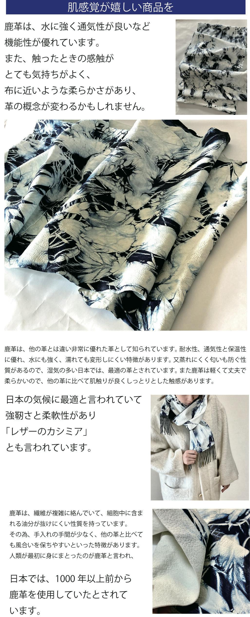 今回新たに鹿革との出会いがあり、「藍染絞りの躍動感あふれる文様の鹿革素材」の柔らかさと強さに魅せられ、この素材を使った革製品を製作することに至りました。