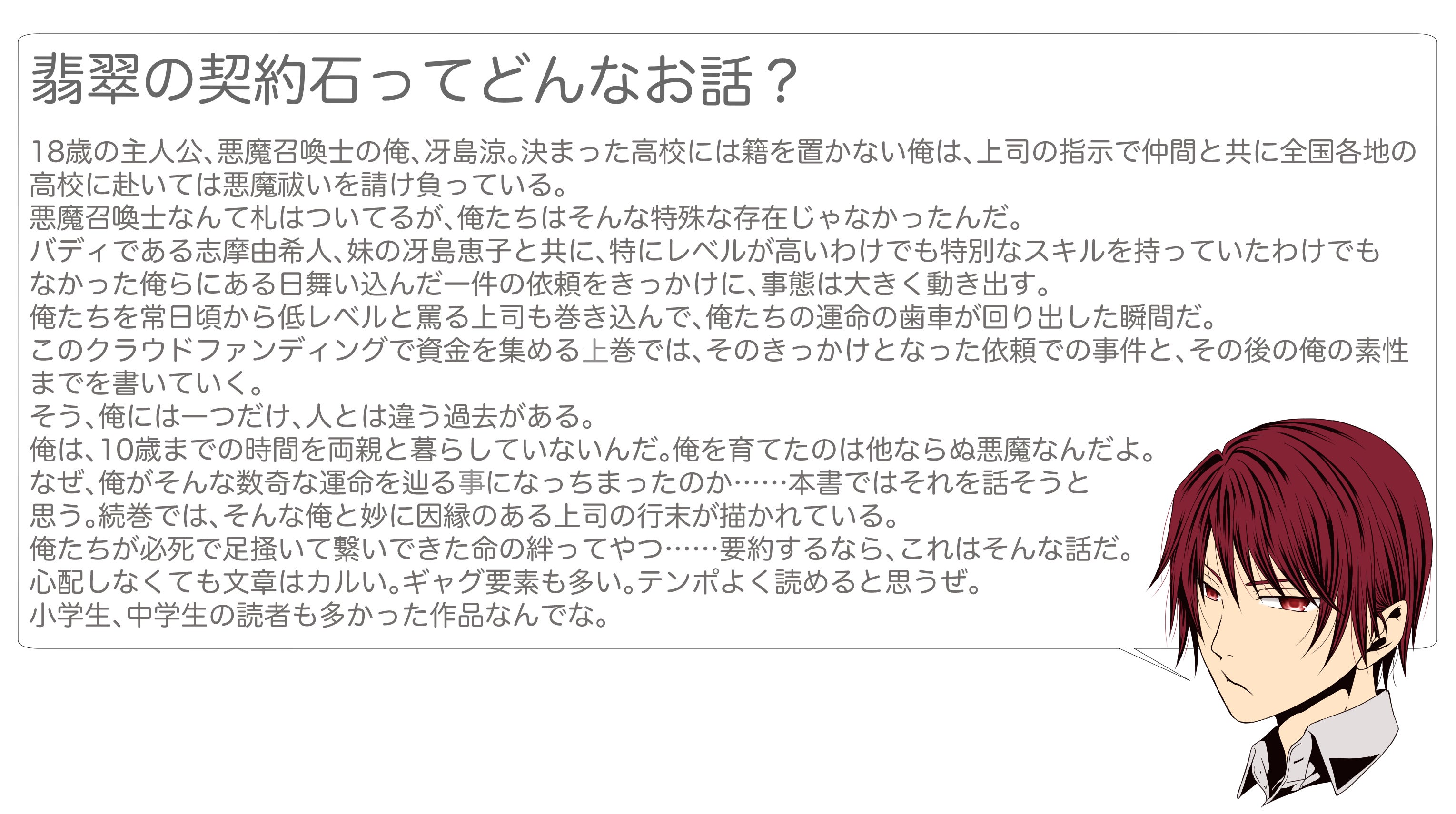 ぜひこの企画、成功させたいのです。そしてより多くの人に翡翠を手に取ってもらいたい。何度も言いますが、翡翠の三本柱は某少年誌と同じものです。子供の頃に消灯後も布団の中でこっそり読んだ、ドキドキの冒険譚。読み止めることができなくて授業中もこっそり開いてしまったあのお話。それら全てがここに繋がっています。文庫としてももちろん、完成はしています。