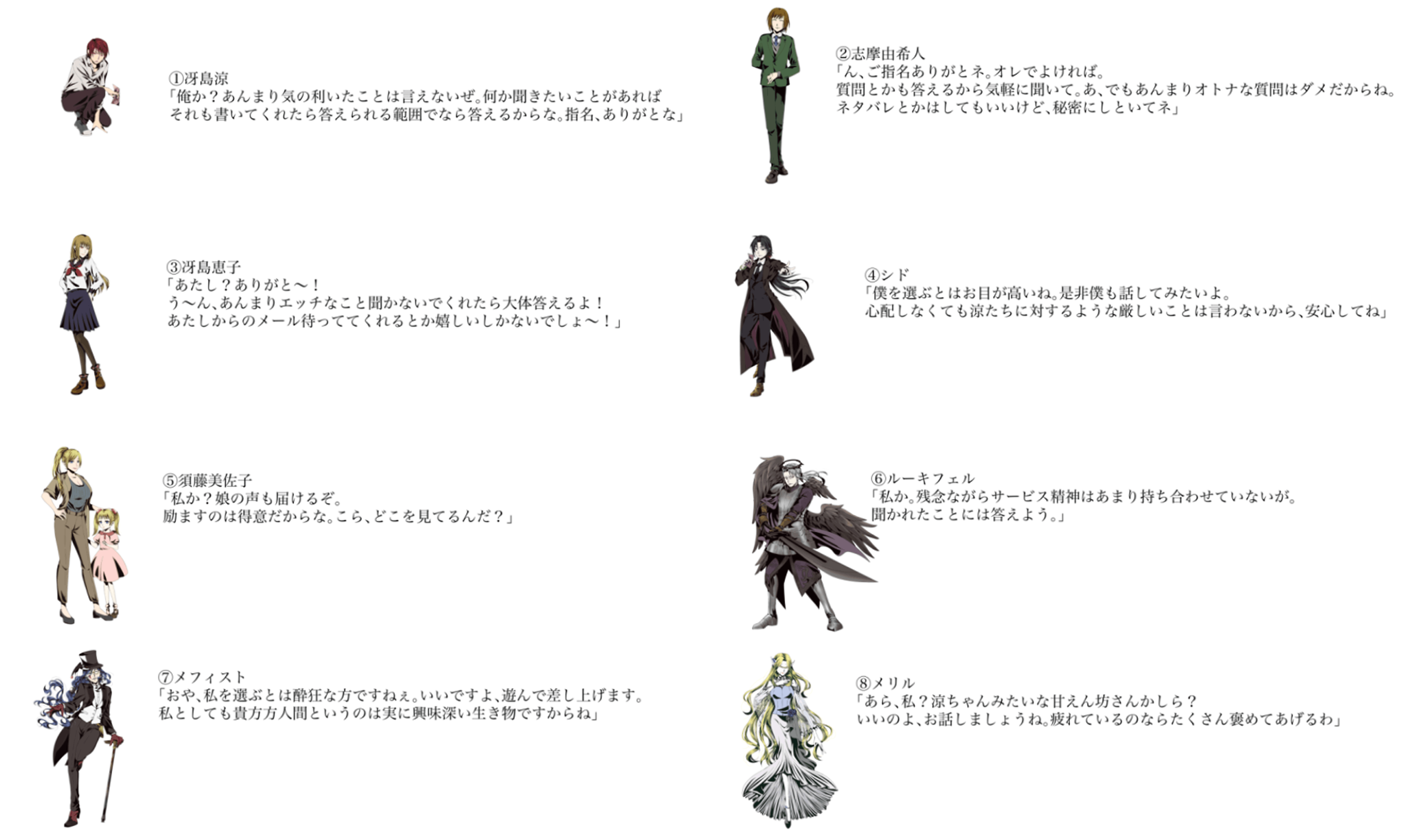 ご指定いただいたキャラクターからメールにてご質問への返答や、ご希望の内容(激励、叱咤、褒め言葉等)のメールが届きます!どのキャラクターから欲しいか、下の説明を読んでお選びくださいね。