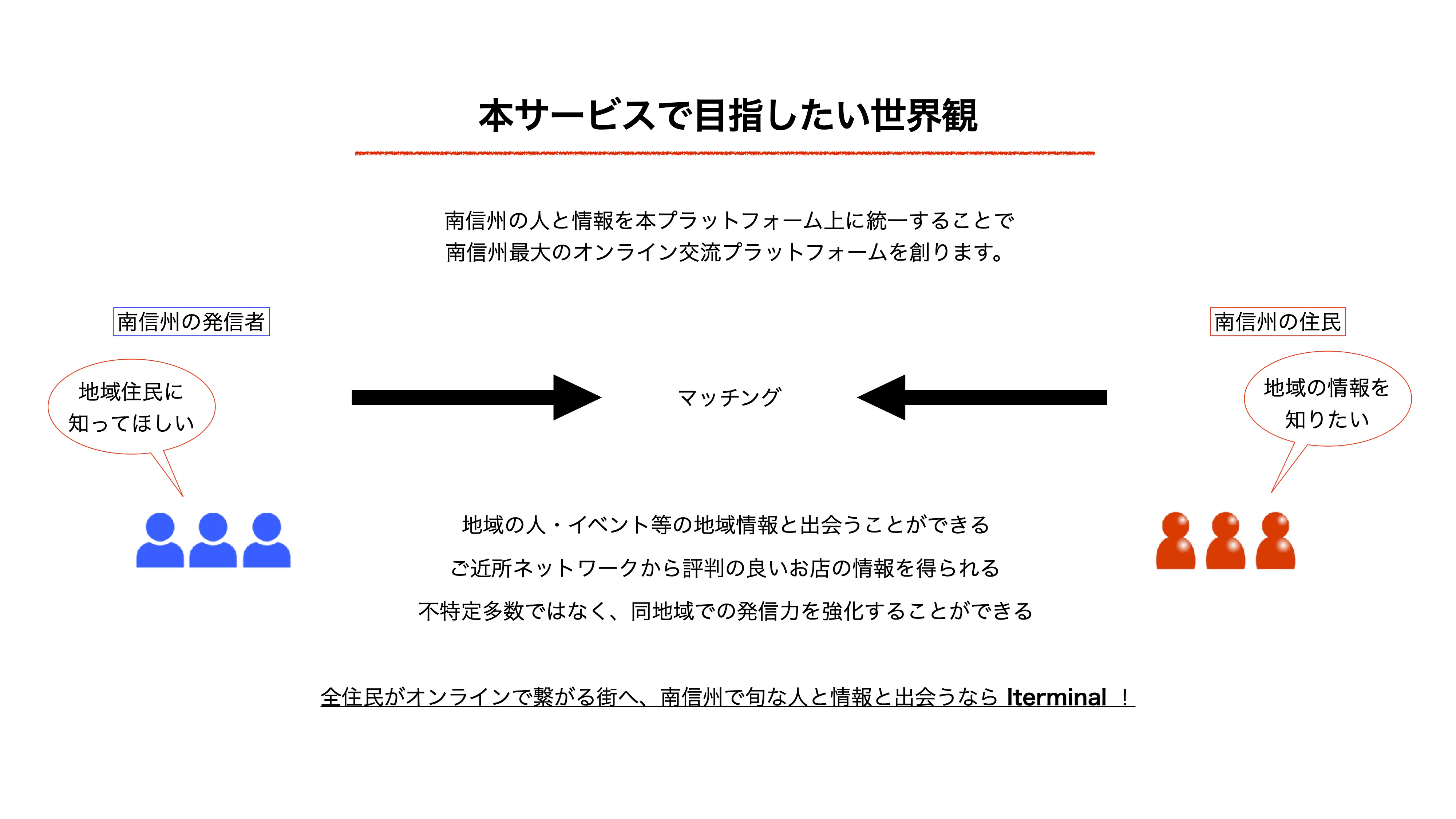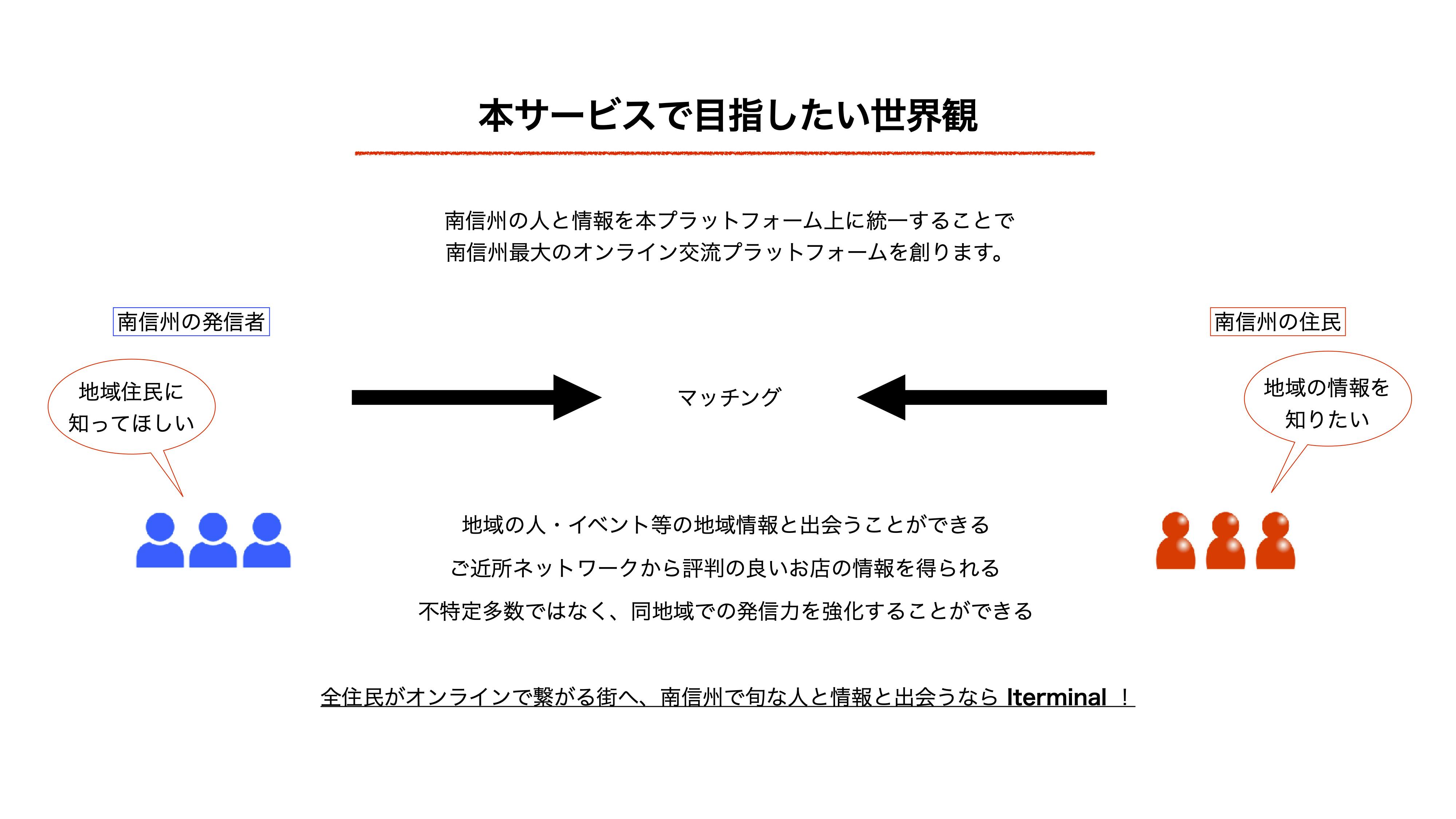 そのために、ユーザーと地域を南信州に絞り、地域の魅力を同地域に対して自由に発信できる新たな媒体・発信塔となるオンラインプラットフォーム【Iterminal(アイターミナル)】を創ります!