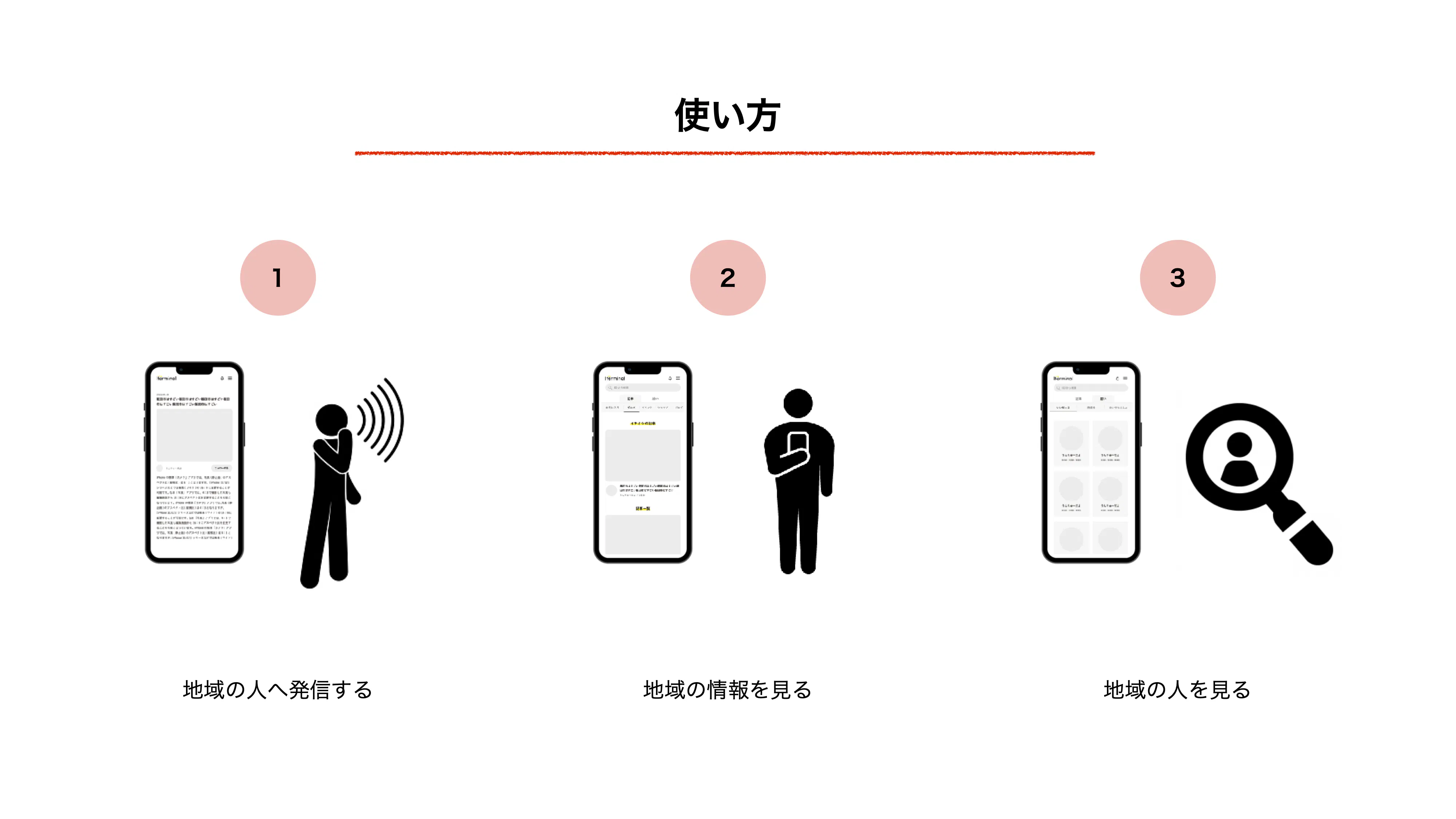 Iterminal は、発信者が投稿した内容を見れる【記事】と地域住民と繋がれる【結い】という2種類のページから成り立ちます。