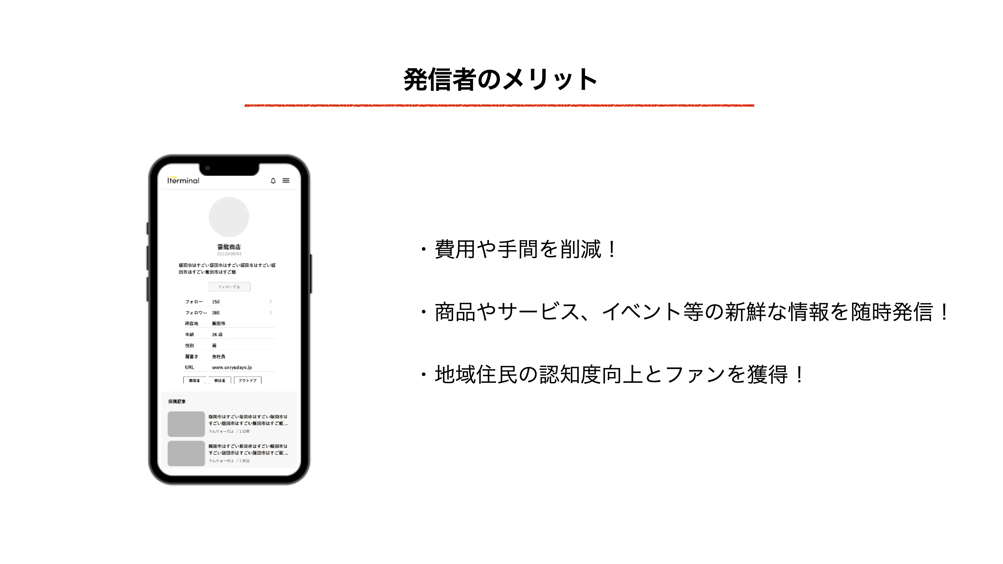 Iterminal なら、南信州の地域情報(お店・エンタメ・人等)を発信する新たな発信塔になり、1つのプラットフォーム上に人と情報が集結することで、人と人、人と情報をより繋がりやすくし、地域内の交流及びマイクロツーリズムを促進する良いきっかけになれると思っております!