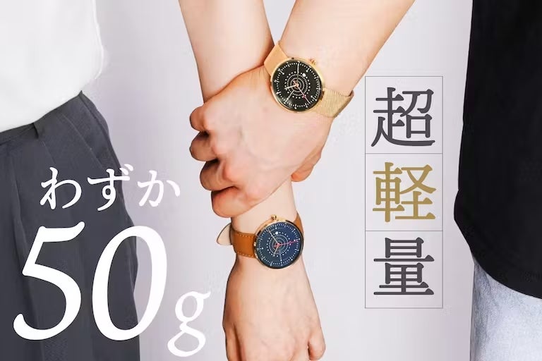 ゴールドカラーのケースとブラックの文字盤はラグジュアリーな雰囲気抜群。見た目の重厚感に反して「50g」という超軽量。付け心地にも配慮された豪華なデザイン。