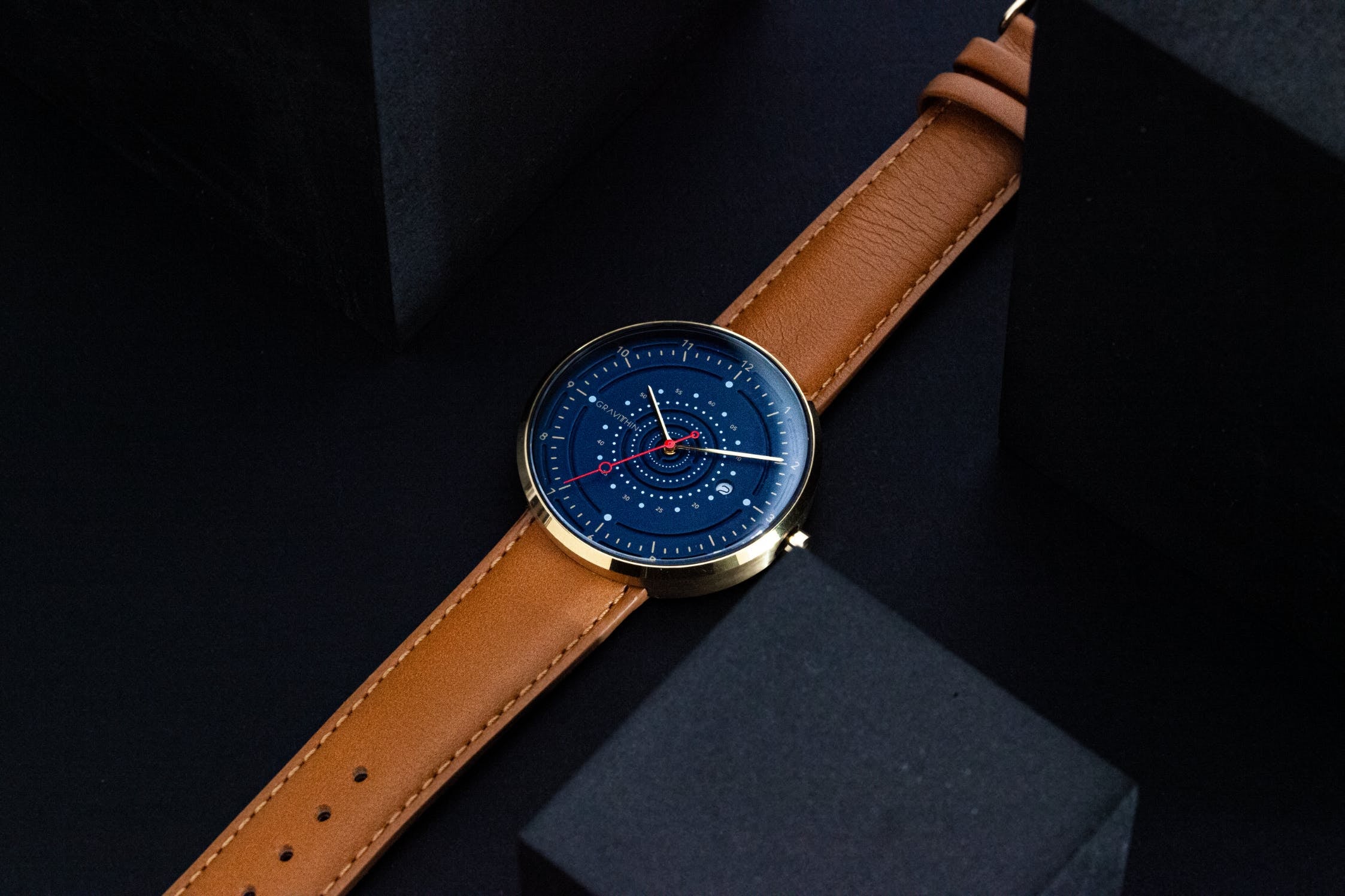 ストラップ:フルグレインレザー・キャメル - 深いブルーの文字盤にゴールドと赤の秒針が遊び心あふれるAR-03は、身も心も解放される休日にぴったりの腕時計です。