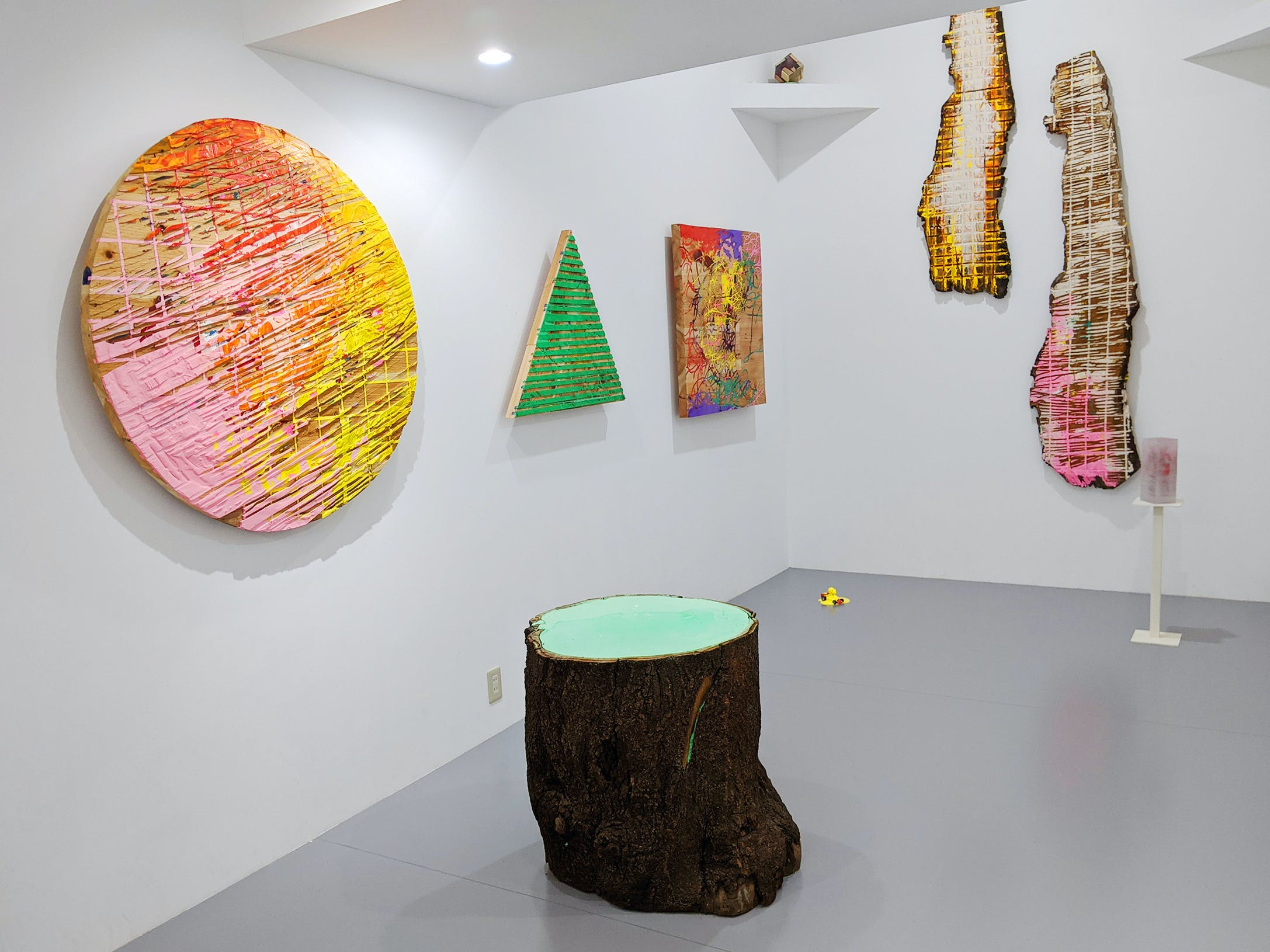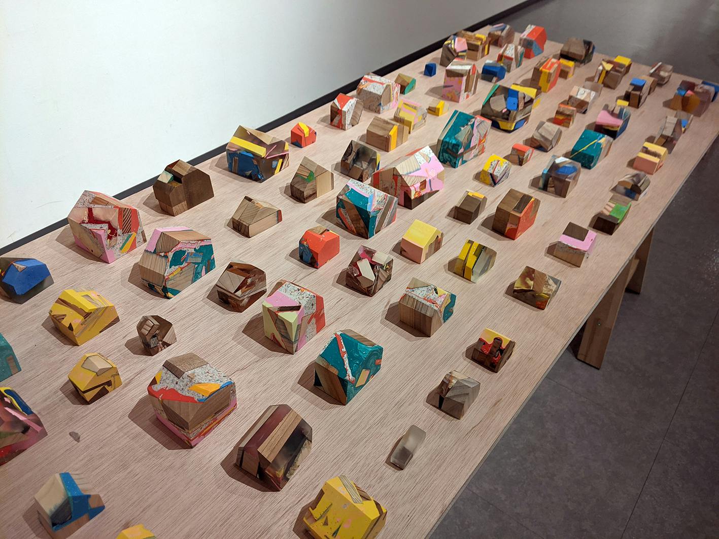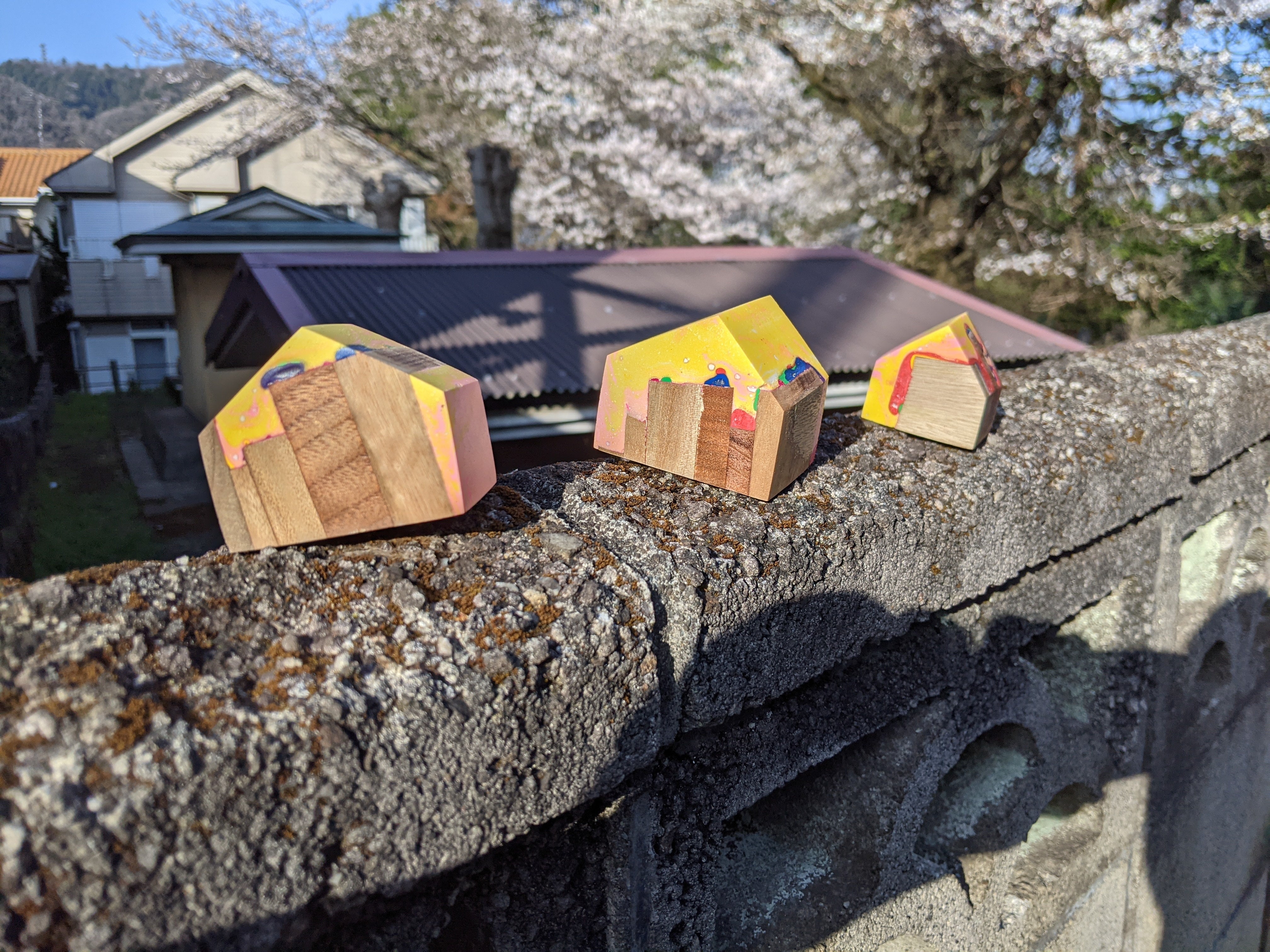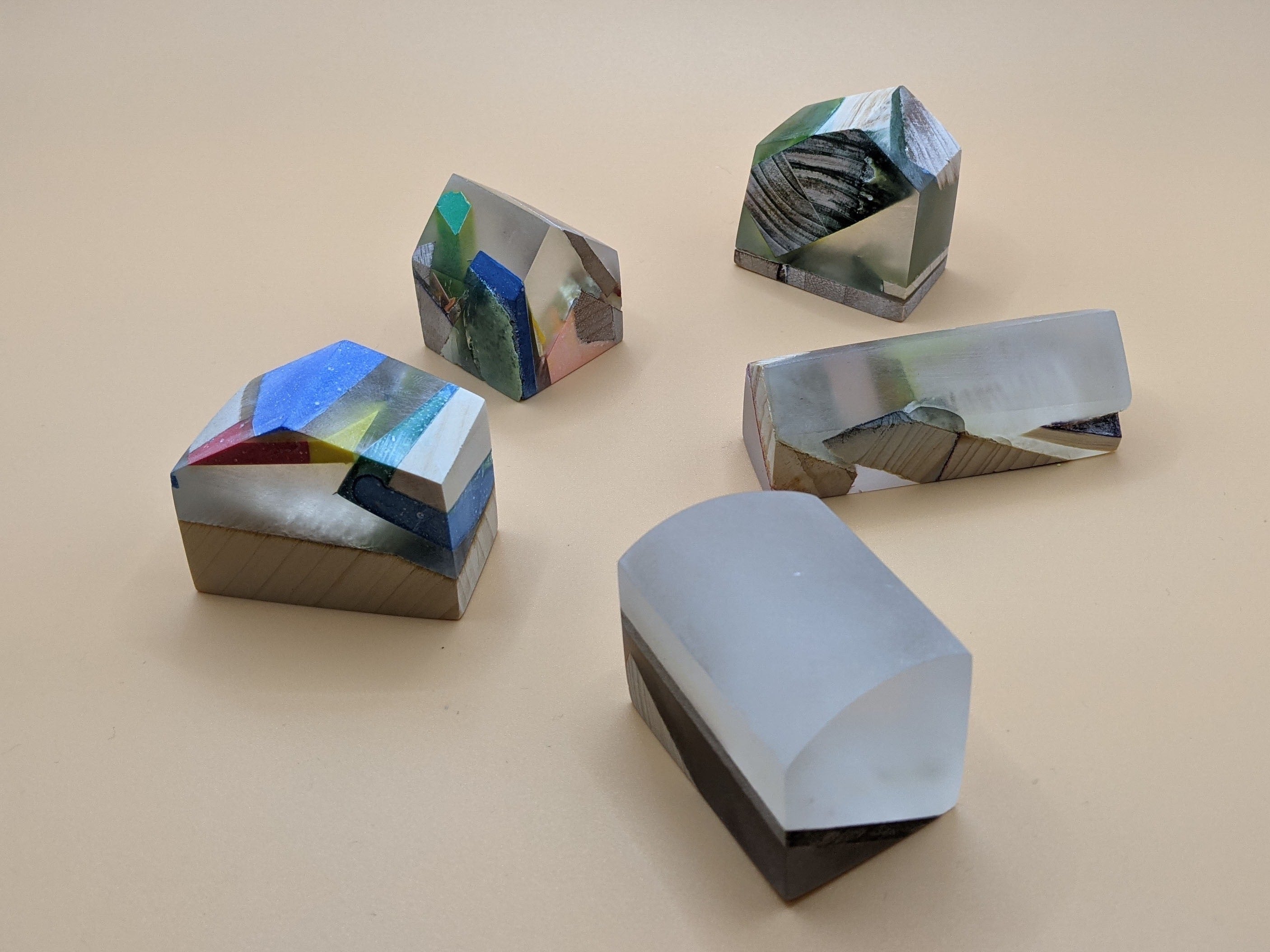 木材を使用した作品制作を得意としており、様々な木種を使用した積み木のようでカラフルな彫刻や木材×透明樹脂や木材×ジェスモナイト 樹脂など木材と異素材を組み合わせた作品を制作しております。