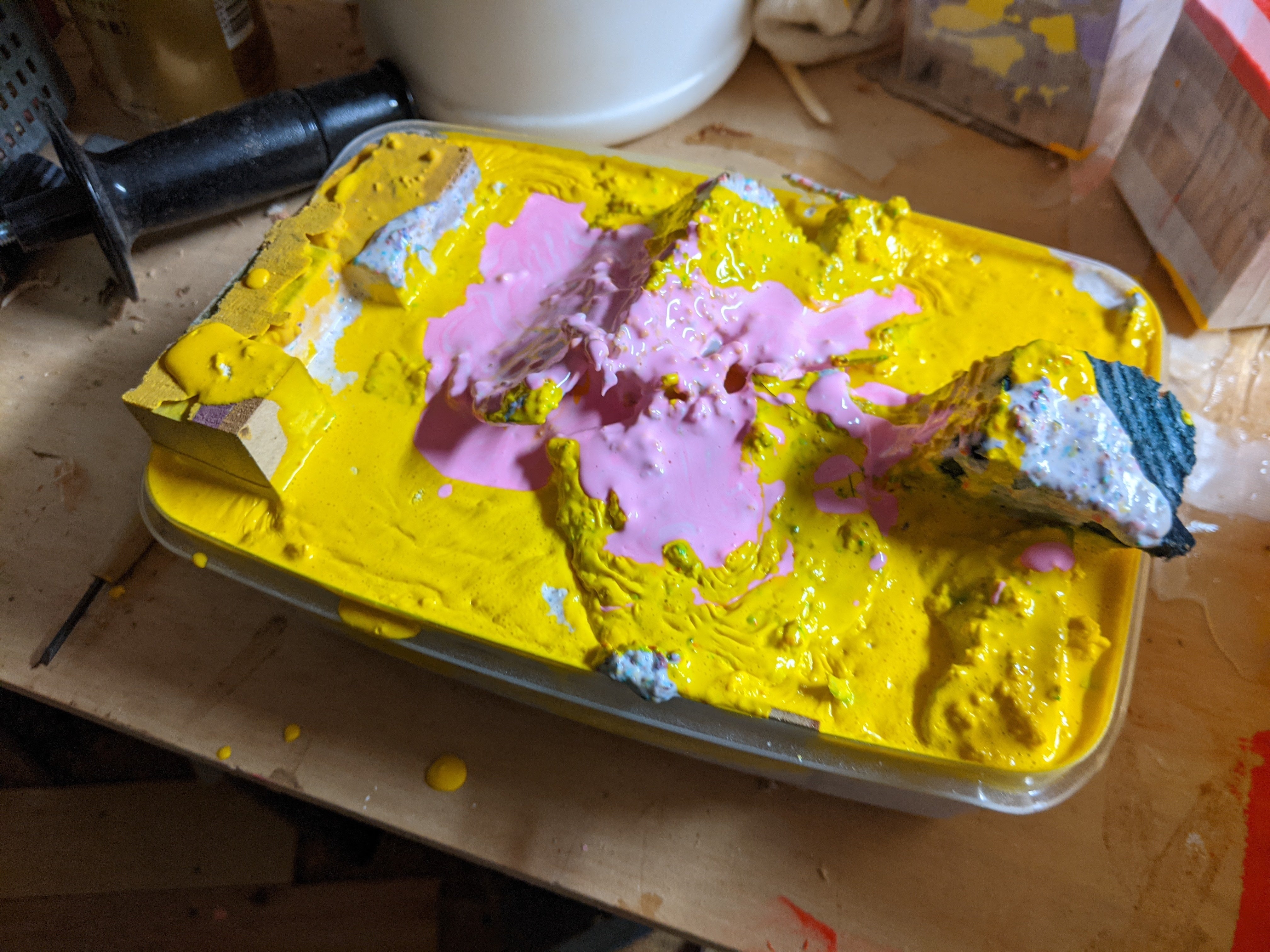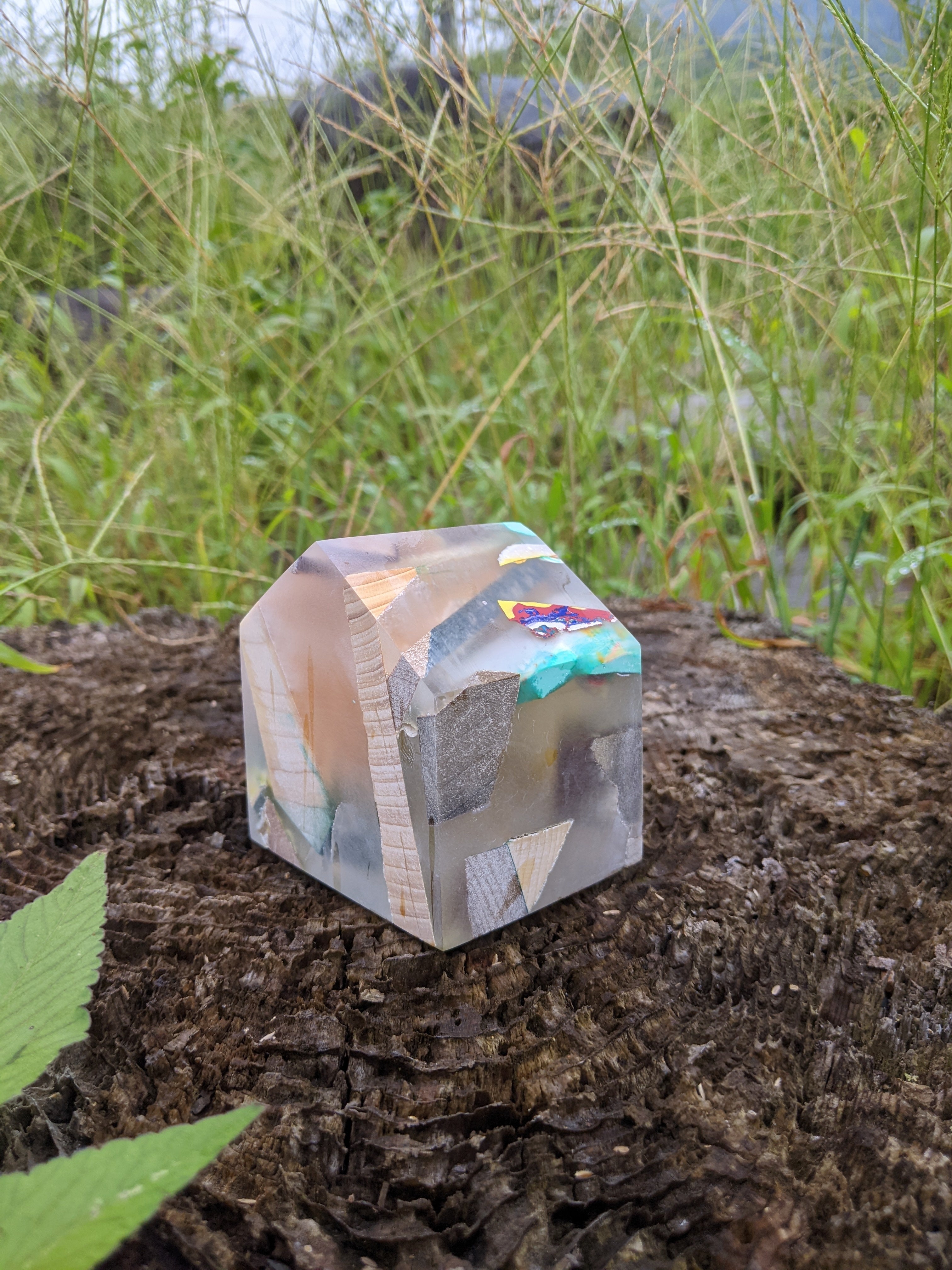 これらの端材たちを大きな容器の中に入れ、透明樹脂やジェスモナイト 樹脂を流し込みことで大きな塊を作ります。
