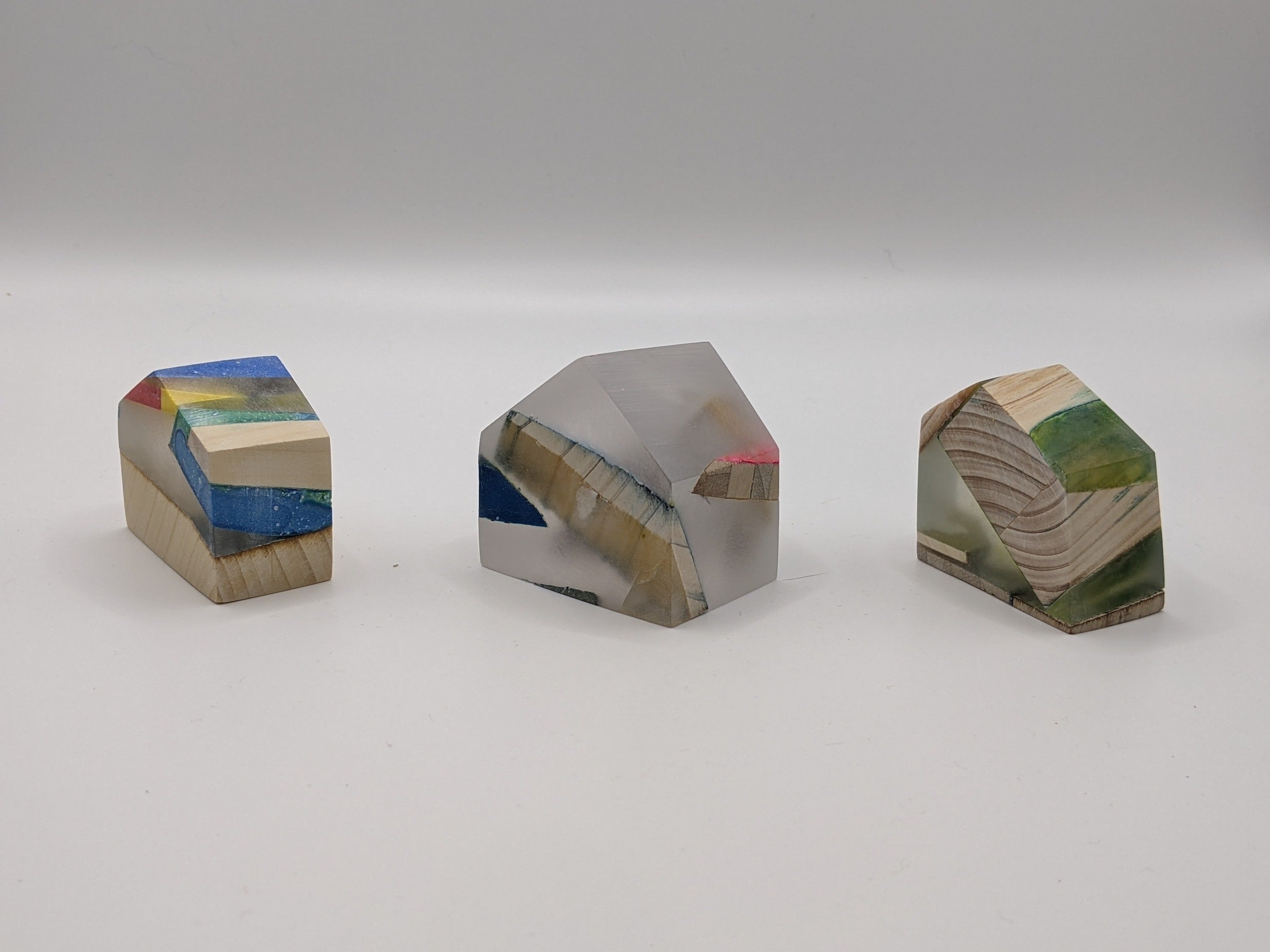 木材を使用した作品制作を得意としており、様々な木種を使用した積み木のようでカラフルな彫刻や木材×透明樹脂や木材×ジェスモナイト 樹脂など木材と異素材を組み合わせた作品を制作しております。