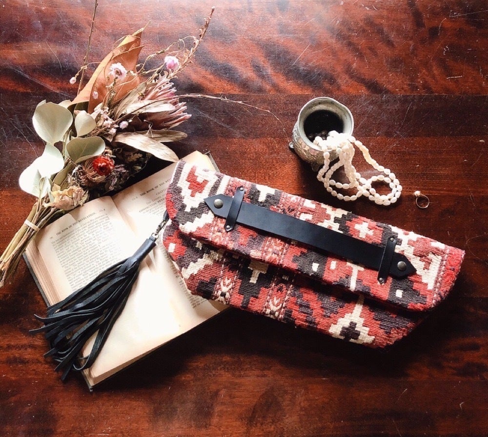 中東の織物キリムでファッション雑貨、インテリア雑貨をデザイン制作しています。キリムは遊牧民が草木染めをした糸を使い手織りで織りあげる織物です。民族によってデザイン、技法が違ったりするのですが一点モノのキリムから新たな作品を作り上げています。