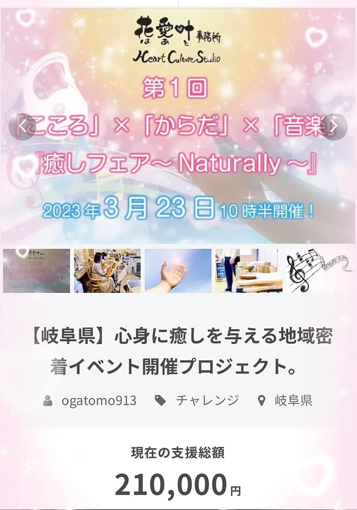 2023/02/02 15:0712月24日から1月31日までのクラウドファンディングが終了しました。あたたかいご支援をしてくださった皆様、本当にありがとうございました♡おかげさまで合計21万円のご支援をいただきました。お一人、いただいたメッセージに私が気づくのが遅く、代理申請できませんでした。ごめんなさい。その方が1万円を入れようとしてくださったので、そのお気持ちも合わせると22万円です。今まで、直接やLINEなどでたくさんのメッセージをいただきました。その優しさや想いに私は幸せいっぱい。その愛情エネルギーもいただいて、これからイベント当日に向けて、出演・出店の方々と準備を進めていきますね。私にとって大きな挑戦!楽しみながら取り組んでいきます。皆さまのご支援が励みになり、力になります。本当にありがとうございました╰(*´︶`*)╯♡入場券やリターン発送までしばらくお待ちください。 もっと見る