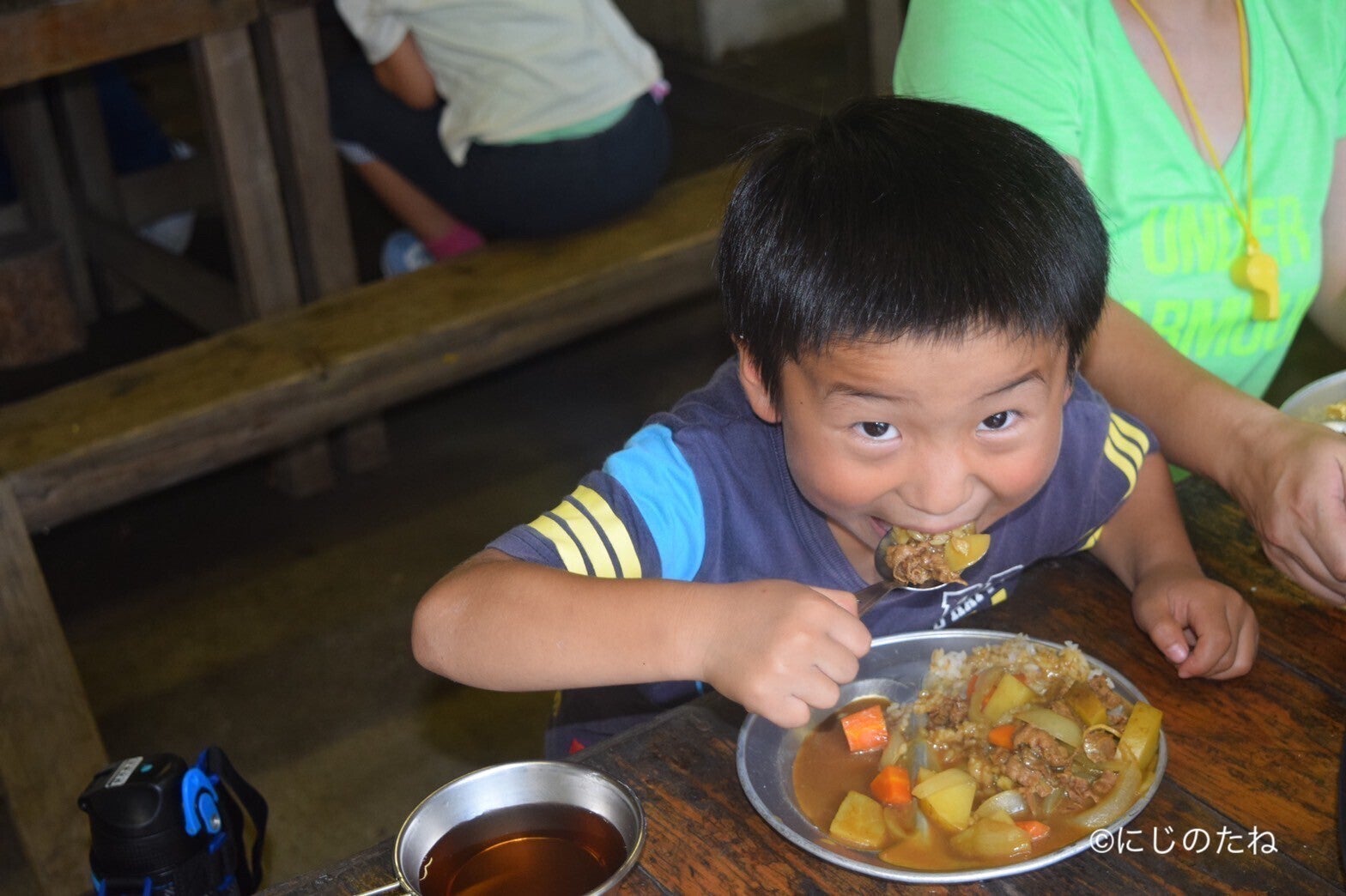 給食で出てきたちょっと苦手だったマーマレード、キャンプ場で作った熱々のカレーライス、市民プールからの帰り道で食べた真っ青なかき氷、デパートの屋上で母と一緒に食べた甘めのたぬきうどん、子供の頃に食べたものを思い出してみると、必ず、その場所や風景、におい、感情が伴います。そらのたね様が大切にされている「食・学・遊」という言葉を通じて、気づかされました。遠足で食べたおにぎりに詰まっていたのは、具だけじゃなく、学びや遊びといった体験そのものだったのだと。かまどで作ったご飯ともなれば、なおのこと、子供たちの心の中に強烈な体験として残り続けていくのだろうなと感じます。山々を繋ぐように空に浮かぶ虹。そんな環境の中で、子供たちが楽しく過ごせることを切に願っております。