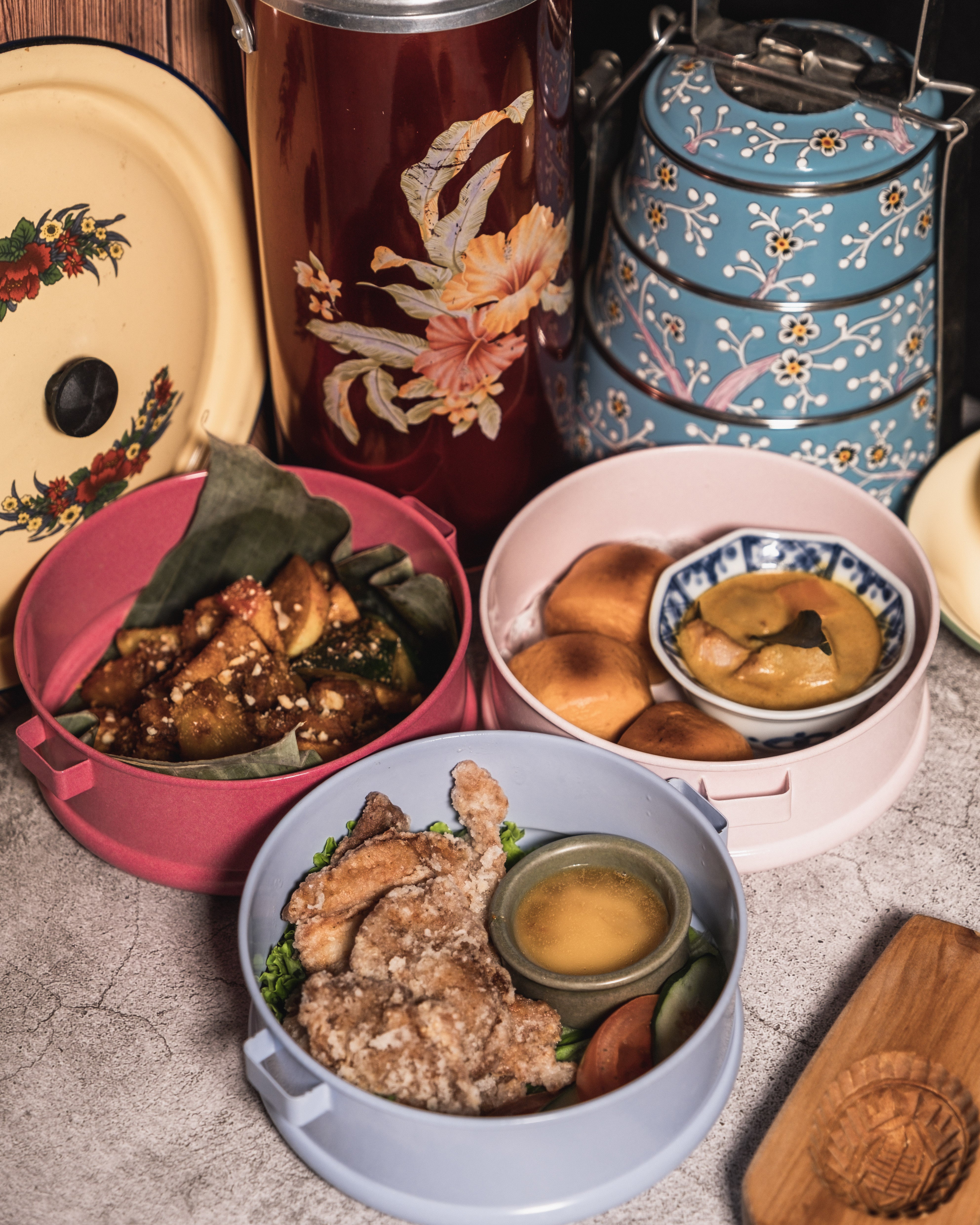 TIFFIN に入ったのは、「南乳豚唐揚げ」 「手羽先の塩卵唐揚げ」 「揚げカレー饅頭」等華人系マレーシア文化を代表している料理です。当店では温かな家庭料理を一品ずつ詰めたTIFFINを出し、お客様がそろって食べていただくことを通じて、幸せな時間を提供します。