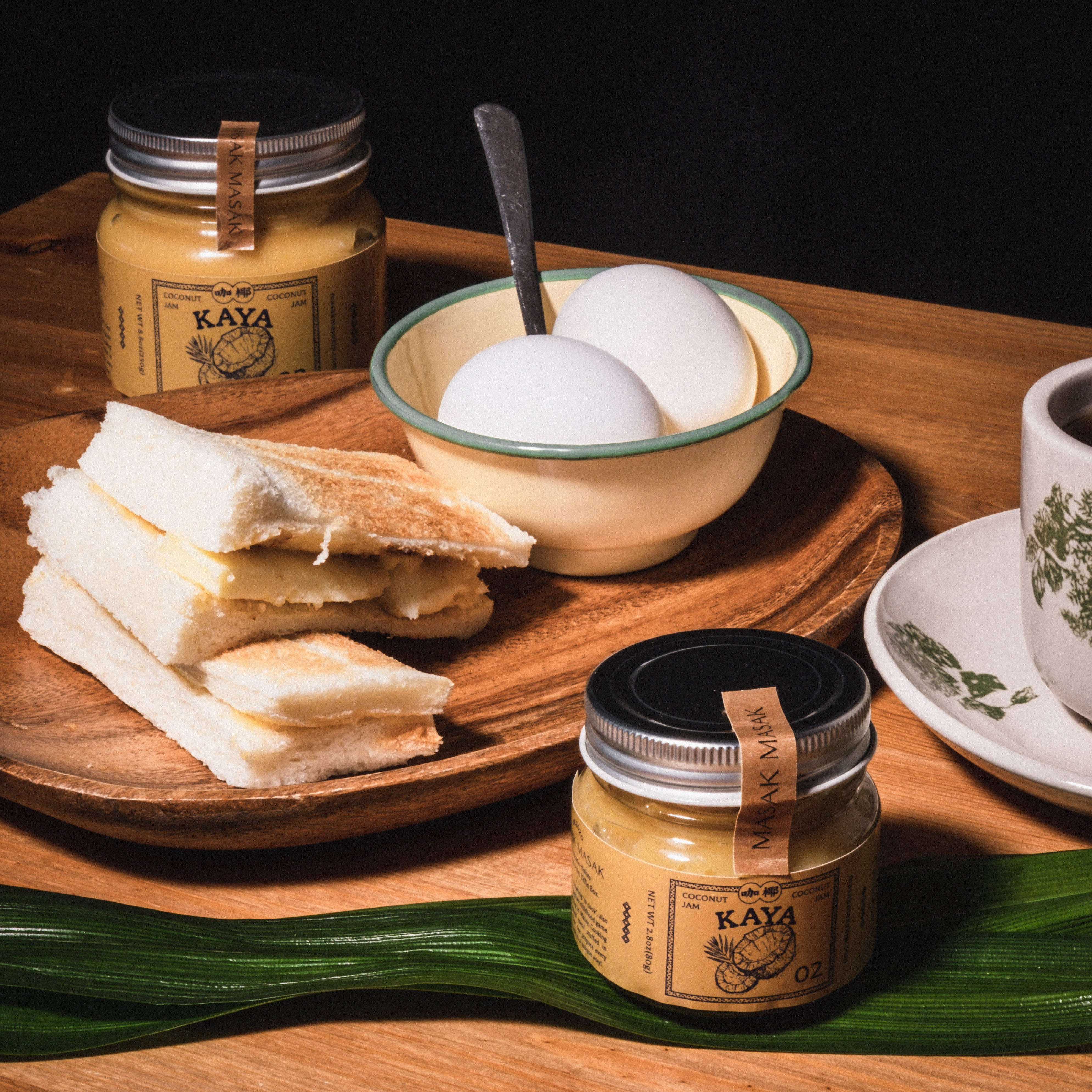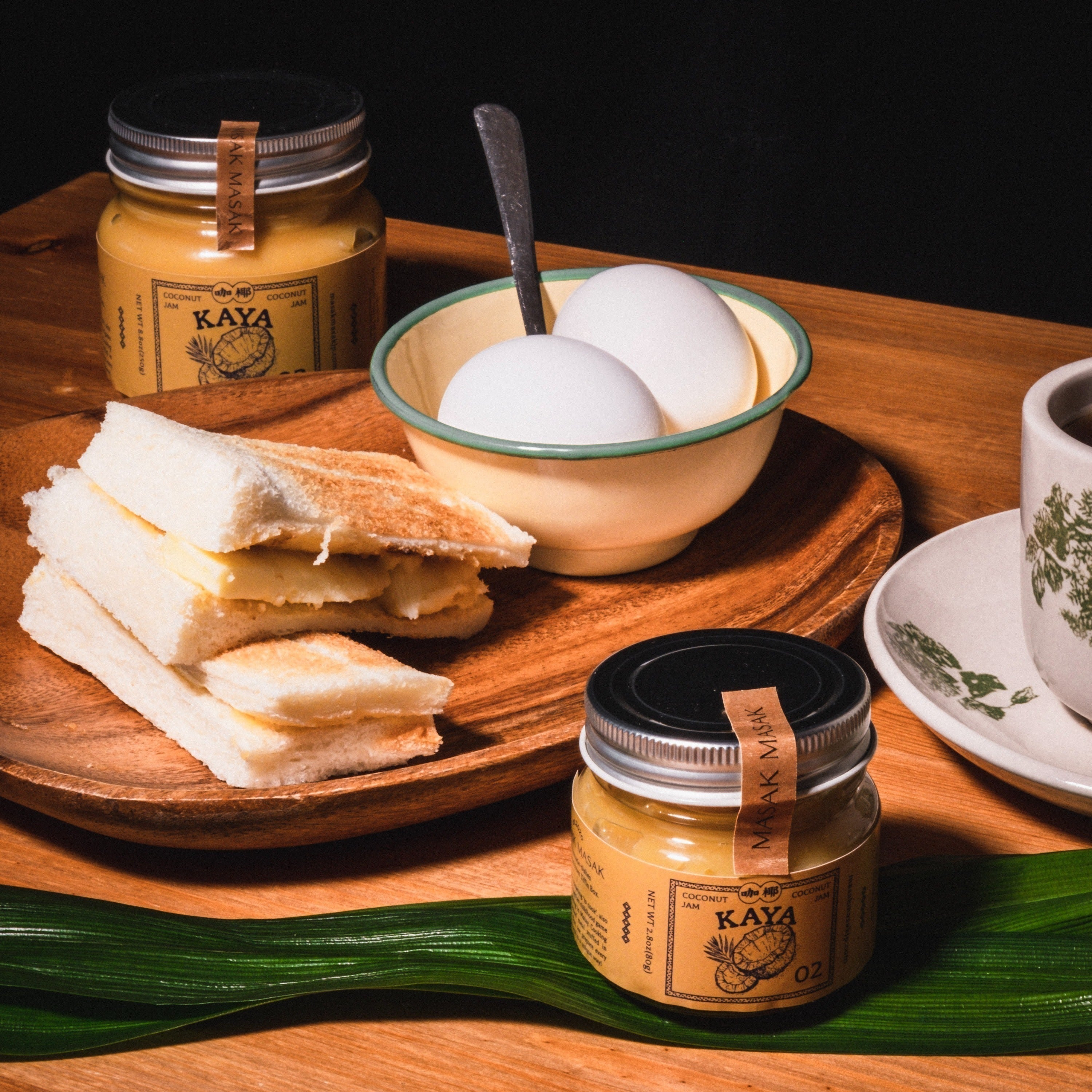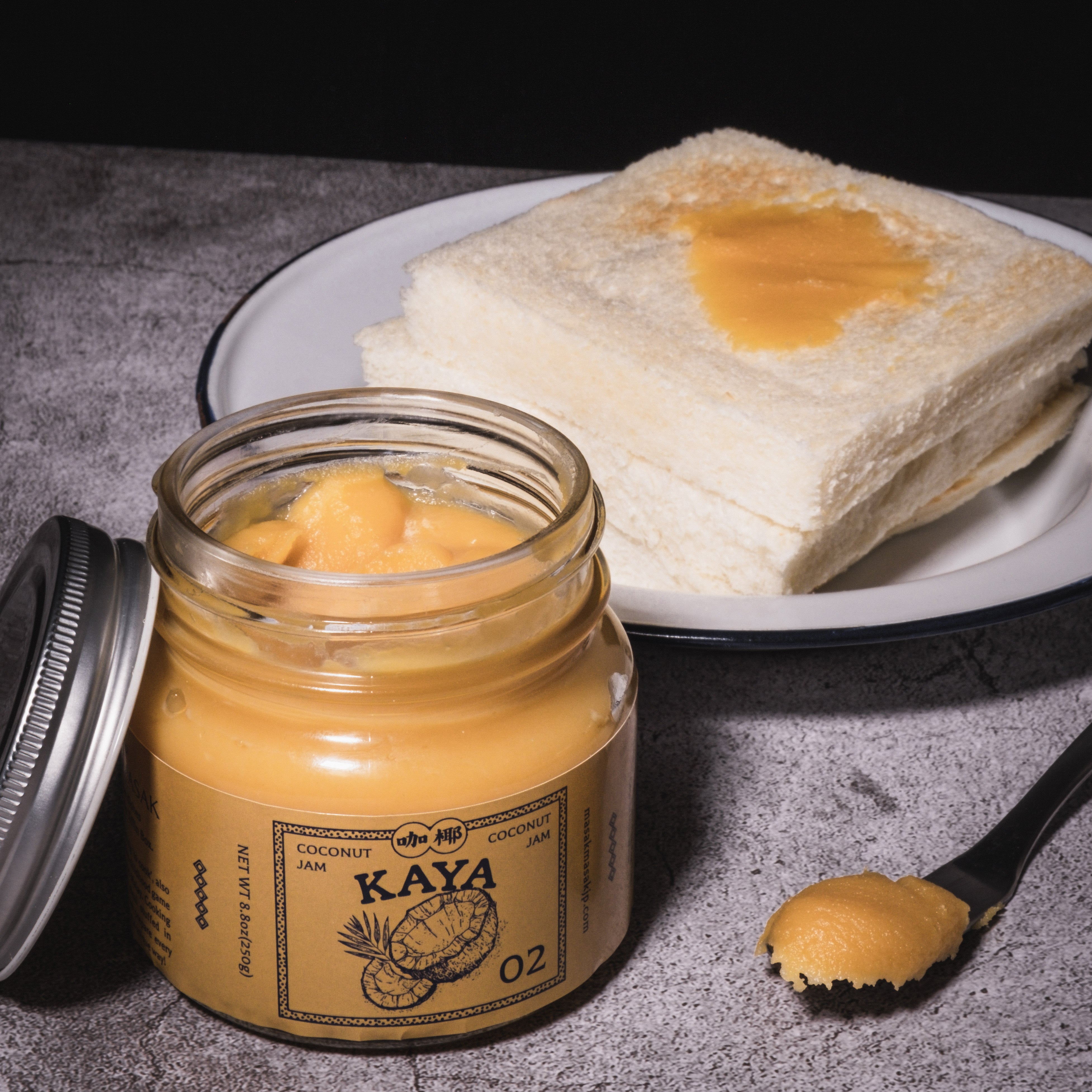 ココナッツミルクに砂糖、たっぷり卵、そして独特な甘い香りを持つハーブであるパンダンリーフを加えた「カヤジャム」というスプレッドです。 マレーシアの朝食である甘じょっぱい「カヤトースト」の中に使用されることで有名です。特に当店のカヤジャムは、癖になるキャラメルのような甘みが特徴です。