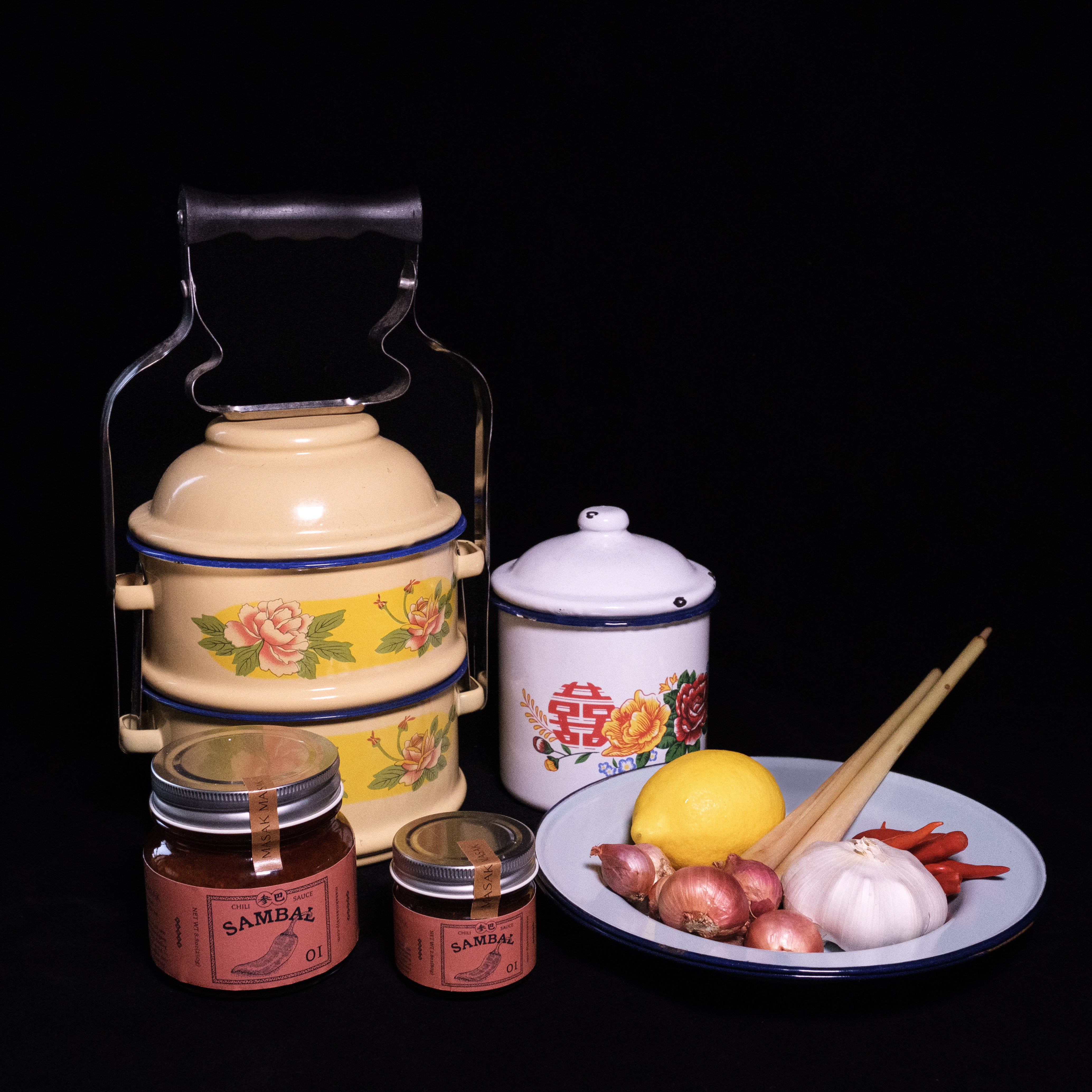 「TIFFIN」(ティフィン)とは、「間食、おやつ」の意味です。 元々はインドから伝わったホーロー製のお弁当箱で、マレーシアではババ・ニョニャにより彩色を施され、かわいらしいデザインが特徴です。持ち手もついているので、重ねて持ち運びができます。