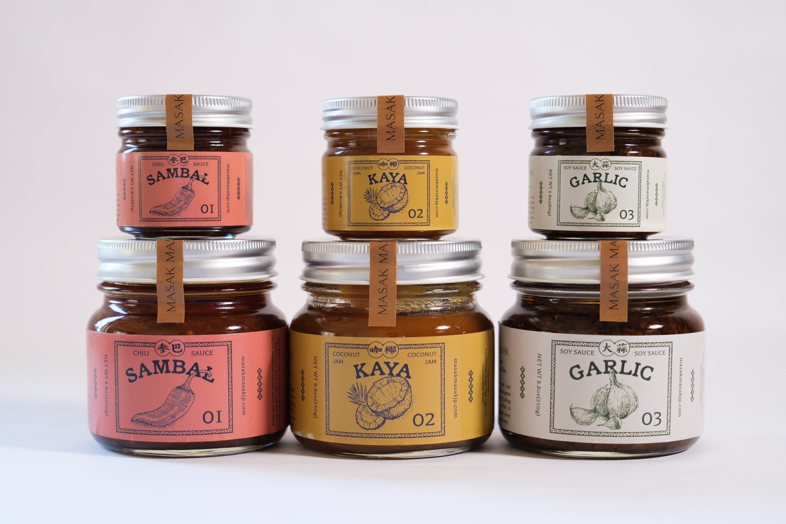 日常生活によく味わえる3つの味を1セットを揃いました。また、全てのソース・ジャムは食べ物に乗せるだけで、簡単・時短でおいしい料理を作れるし、ちょっとエスニックの味も加えれます!お試しや贈り物に最適な小容量サイズとお得な大容量サイズ2種類を提供します。