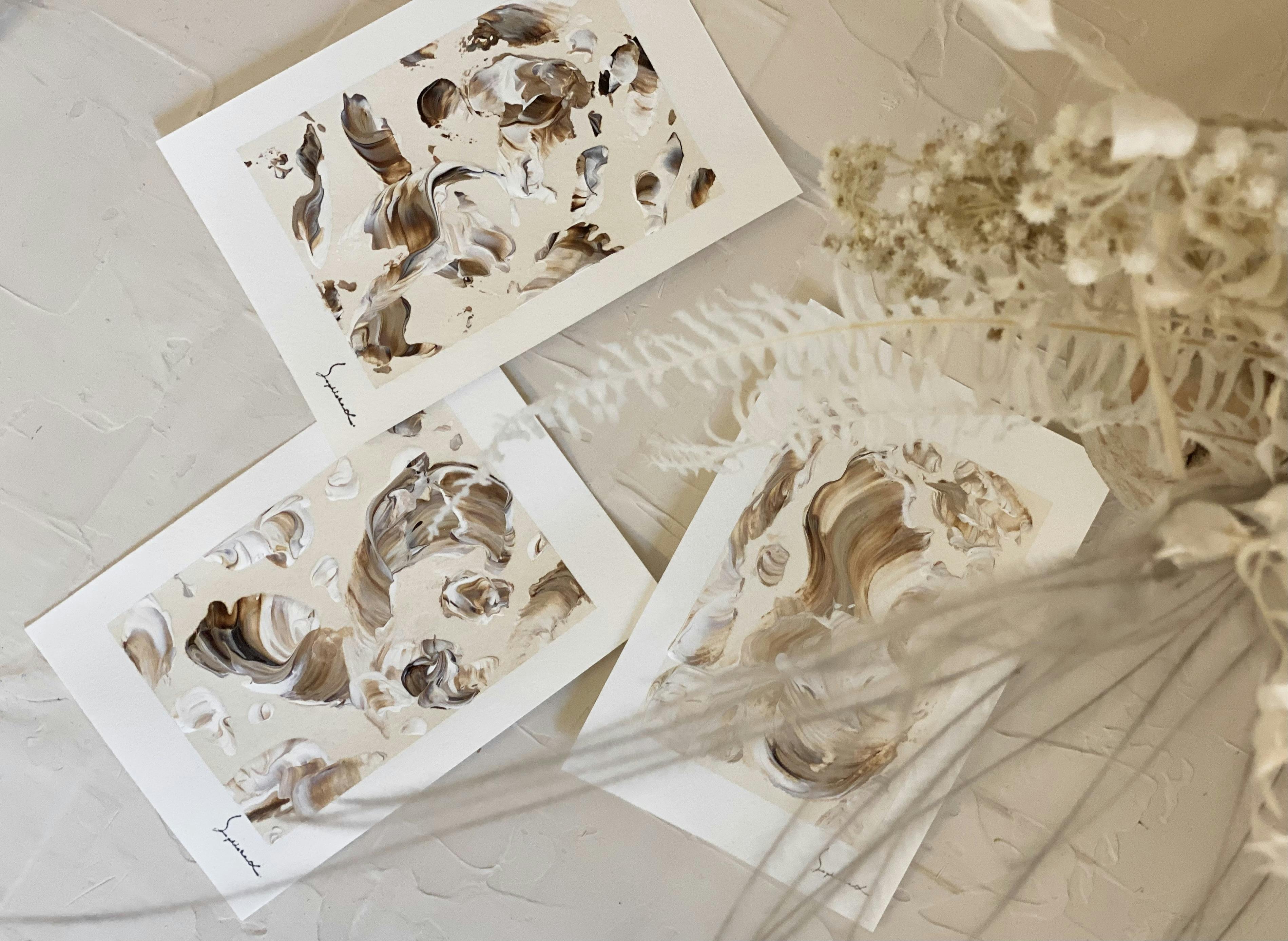 応援くださる皆さまへのリターンには、こころを込めて製作 / 梱包に加えて、下記のようなラテカラーのミニアート(ポストカードサイズ)を同封してお届けいたします。