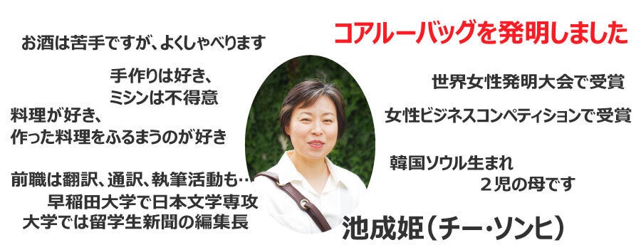 わたくし、コアルーバッグの産みの母、チー(池成姫)と申します。30年前に留学のために来日、日本語学校を卒業後に大学では日本文学を専攻しました。そして就職、結婚、出産、子育て…を経験するうちにバッグの不便さに悩み続けていたある日、このバッグを発明することになりました。そしてコアルーバッグをテーマに起業し、デザインも営業もこなしています。アイデアのヒントになったのは日本の「たすき」や「おんぶ紐」でした。先人の知恵を現代に、しかも毎日のお出かけに欠かせないアイテムに応用できたこと、多くの方々に「便利だね」「ラクだね」と言われるようになったことに誇りを感じ日々頑張っています。