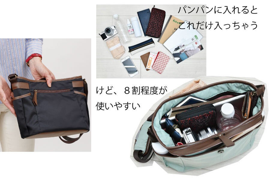 最近は小さめのバッグが流行っているけど、紐も細くなって肩に食い込んで痛くなりがちで、ケイタイと財布だけでパンパンになったり…。あれもこれも入れたいからと、出かけるたびに大き目のバッグを用いるわけにはいかず、気軽なお出かけに相応しい大きさを提案したいと思いました。