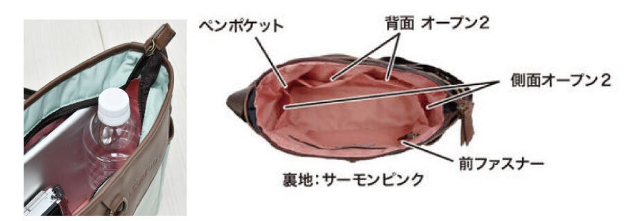 小さめのバッグだからこそポケットの設計は大事だと思います。「マリー」は外にも中にもサイドポケットがあって、小物を入れやすいです。折り畳み傘やメガネケースなどの収納に便利。500ミリのペットボトルがちょうど入る高さなので、倒さずに入れることができます。ペン差しがあるのも便利ポイント!