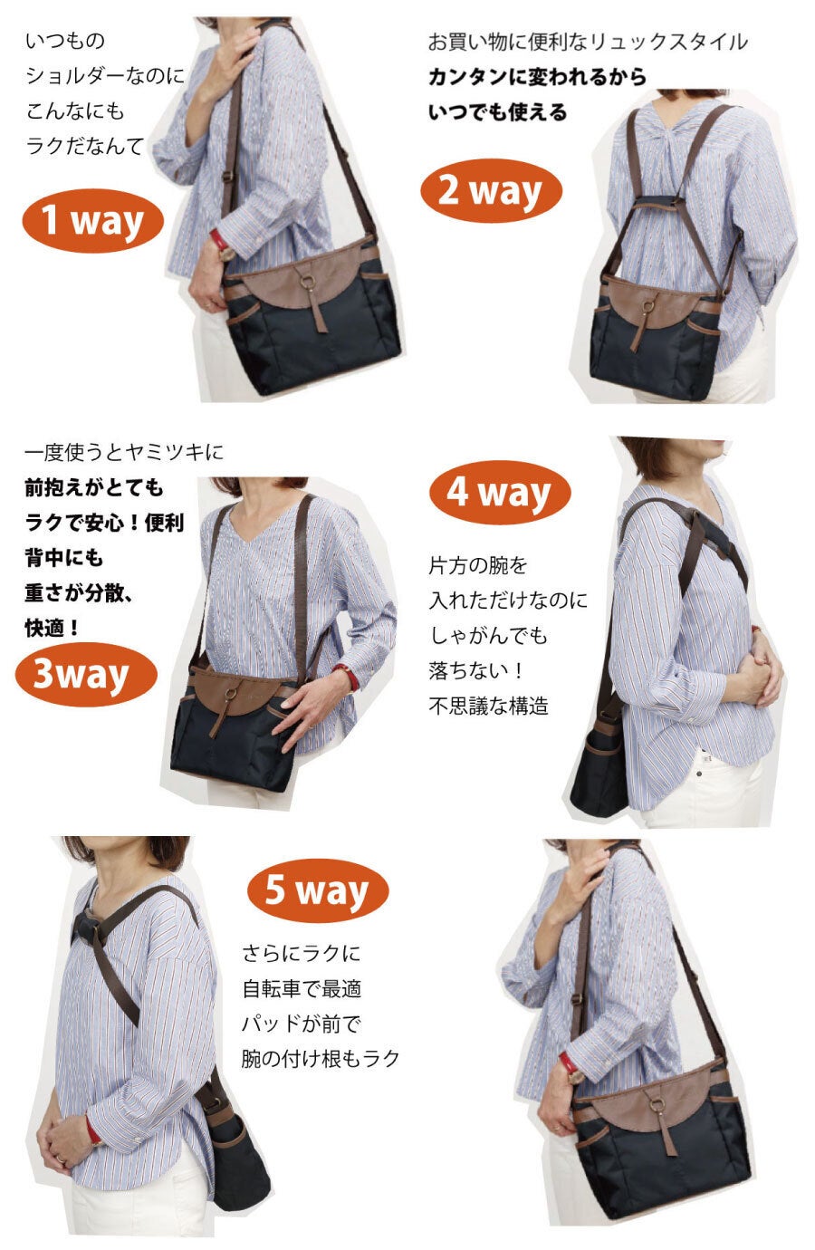 普通に見えて5つの掛け方ができる。これがコアルー! 普段はショルダーで、自転車や荷物が増えた時にはリュックに、周りに人が多い時や座る時には前に持てます。何通りにも使えるからと何本もの紐があるわけではない。何通りにも使えるからと帯に短し襷に長しの不便さを感じるわけではない。それぞれの掛け方にはそれぞれのメリットがしっかりあるので「便利」で「ラク」に感じるはずです。
