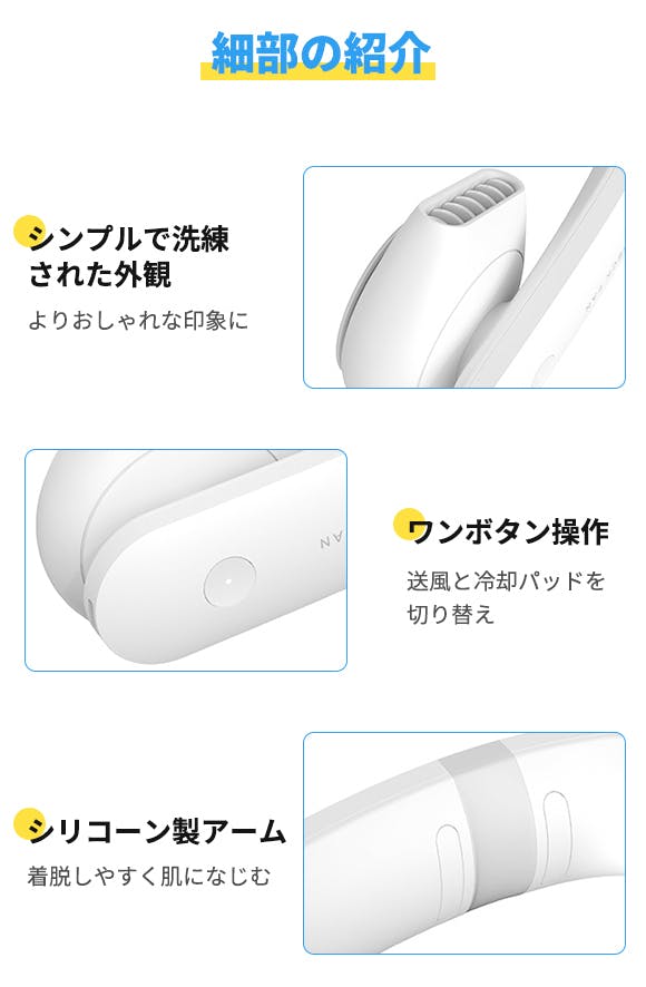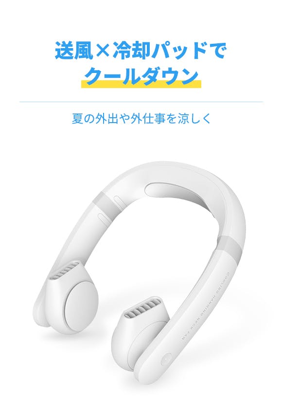 「F13」は風量を3レベルから選べる送風と冷却パッドで、すばやくクールダウンできるネックファンです。ヘッドから送り出される爽やかな風が効果的に体の熱を下げ、首にフィットする冷却パッドが全身を循環する血液を冷やします。このダブルの冷却効果で、いつでもどこでも涼しく快適に過ごせます!