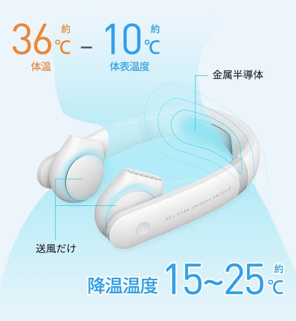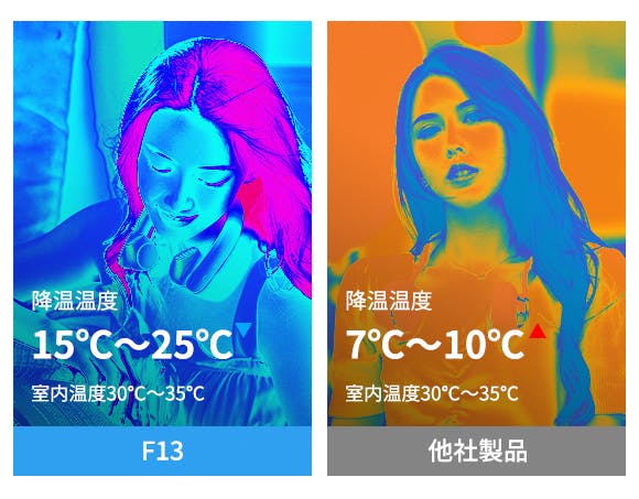 F13はボタンを押せば3秒以内で涼しさを感じることができます。これは、半導体の一種であるペルチェ素子による温度制御技術を採用し、電流によって金属の吸熱と放熱をすばやく切り替えられるためです。うだるような暑さから一気にクールダウン。ぜひお試しください!