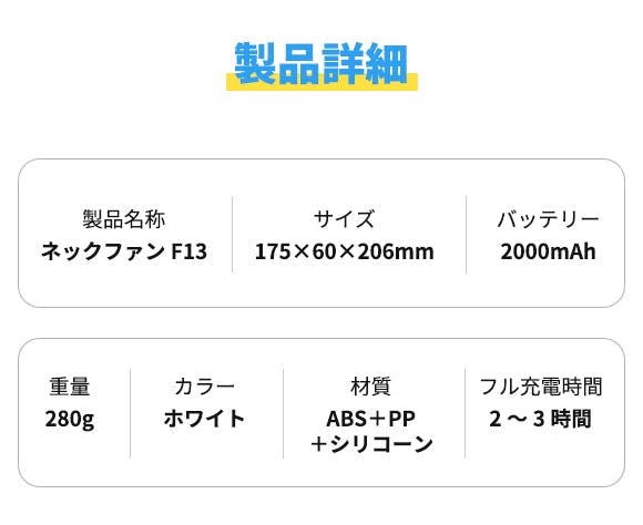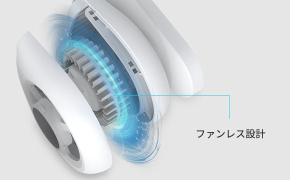 ファン付きの首掛け扇風機は、髪がからまってしまったり、物を巻き込んでファンが折れてしまったりすることがあります。F13はダブルの旋回ドライバーを採用したファンレス設計ですので、このような心配はありません。また、お子様や年配の方がうっかり指を入れてしまう隙間もないので安全です。