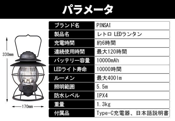 レトロ LEDランタン「PINSAI」の照らす範囲は「約5.5m」。