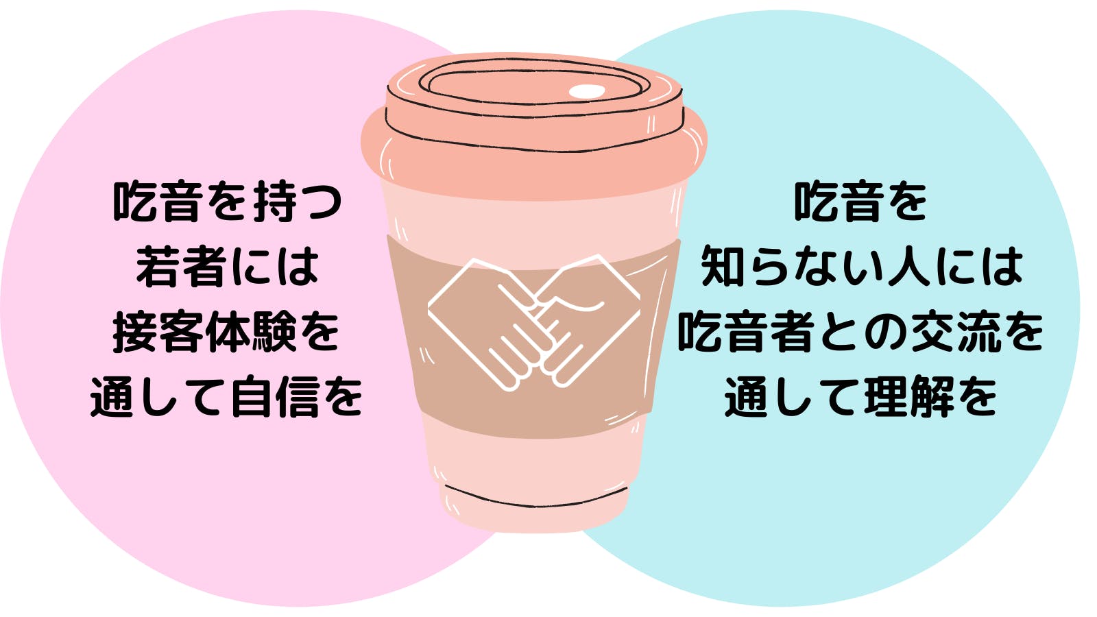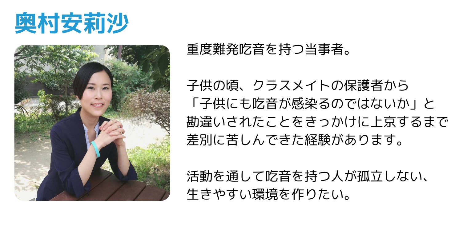 吃音を抱えながらも接客業や様々な夢に向けてに挑戦したいと願う若者たちの夢への一歩を叶えて自信をつけてもらうために、またそういった境遇の若者たちと交流することで吃音について知らなかった方々に吃音への理解を広げることができます。