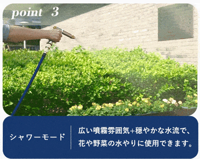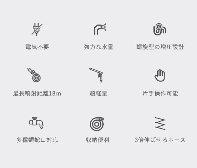 水の圧力はホースの伸縮によって変わることはなく、水道を閉じれば自動で元の長さに縮むので、収納に大変便利です。