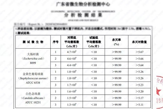 検査内容と結果:大腸菌、黄色ブドウ球菌、カンジダ菌の除菌率は99.99%に達しました。