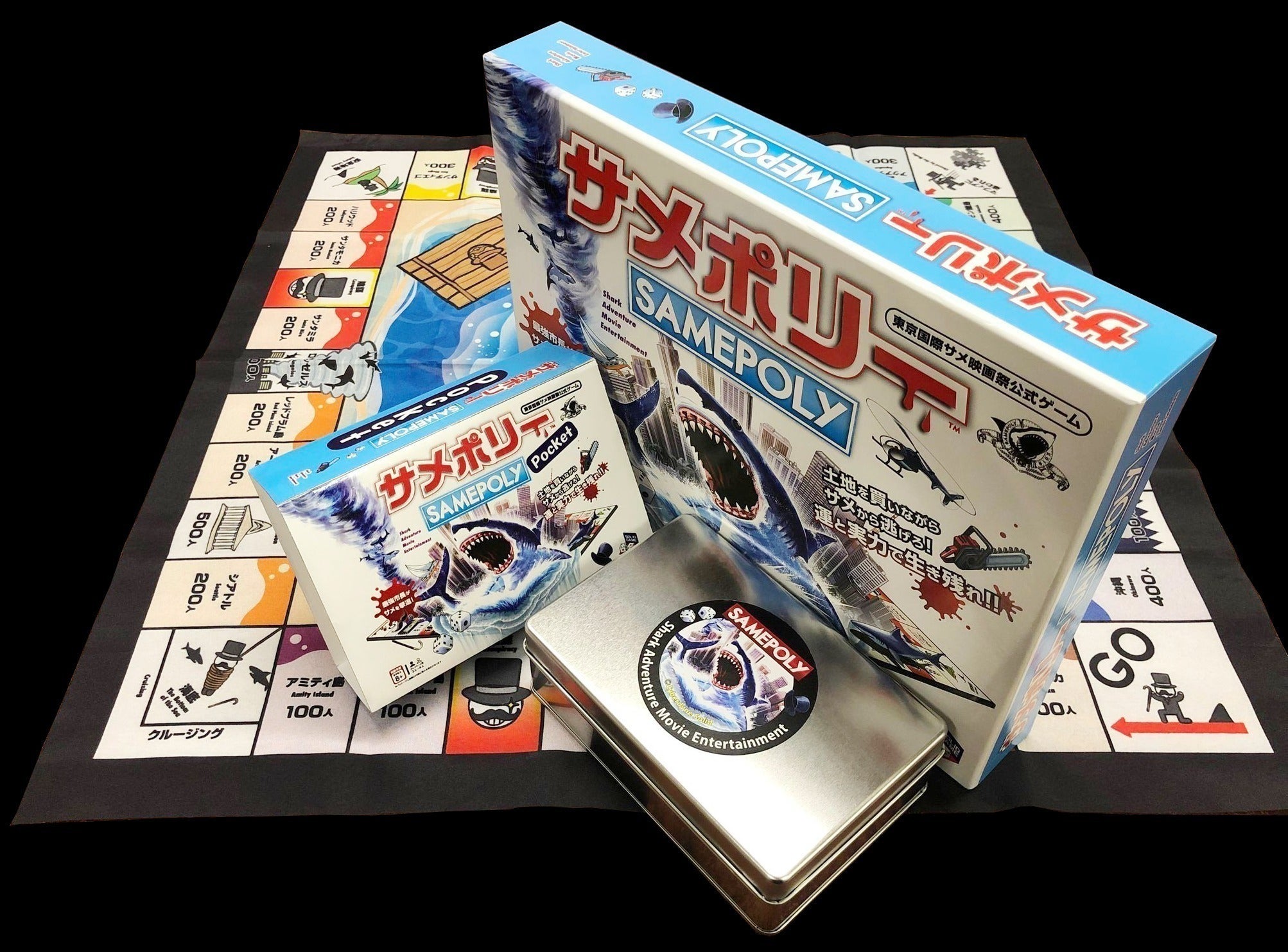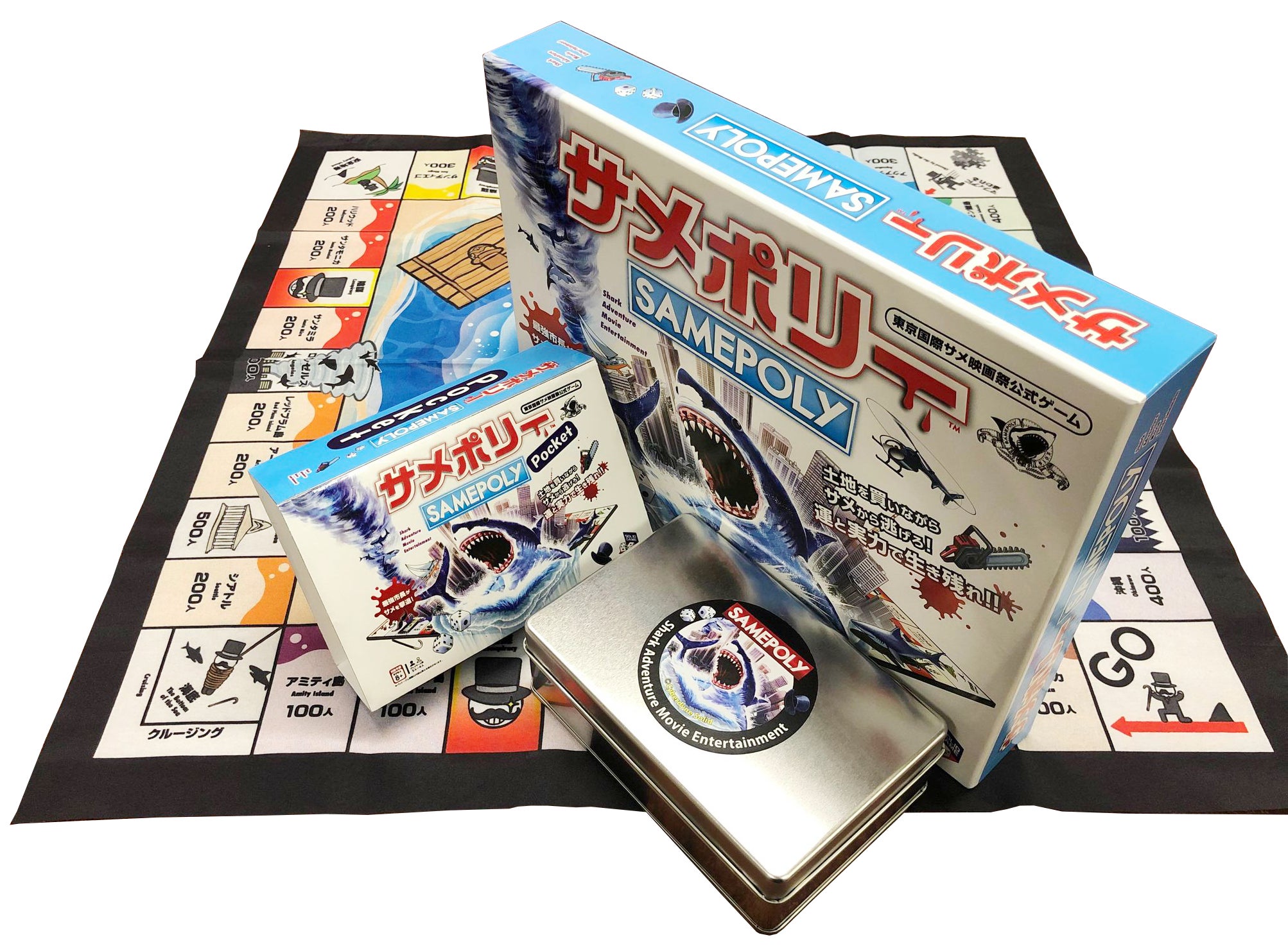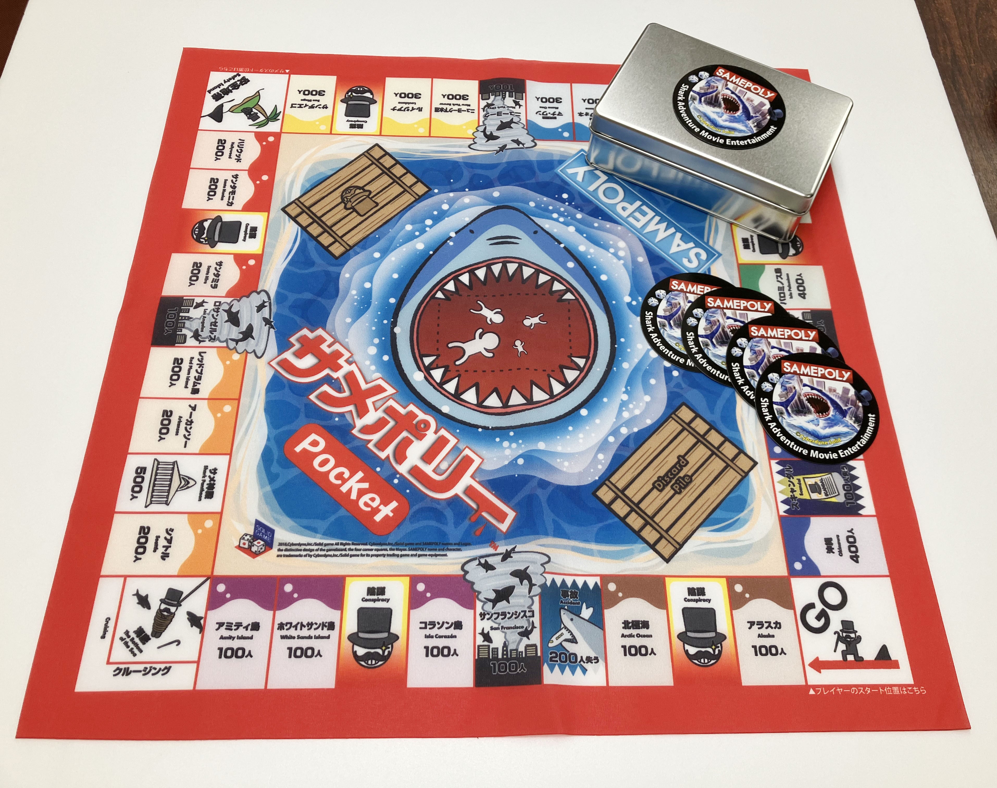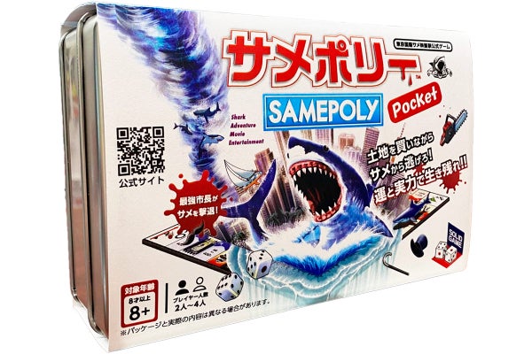 2019年より発売中のサメ映画版「モノポリー」とも言える「サメポリー」を、携帯しやすく進化させた新商品『サメポリーポケット』がクラウドファンディングにて最速でご購入いただけます。
