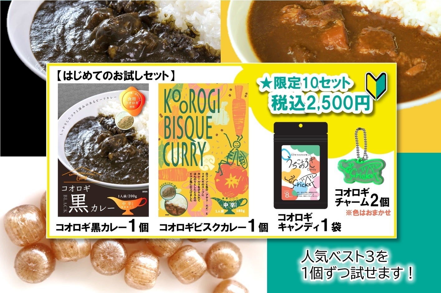 「お試しで、各カレーとキャンディを1個ずつのセットで」とのご要望をいただき、はじめての方向けに人気ベスト3(コオロギ黒カレー、コオロギビスクカレー、うちこおろぎキャンディ)1個ずつのセットが登場。他のセットより少し割高ですが、はじめて食べる方にはおすすめです。限定数のみとなりますので、どうぞお早めに!