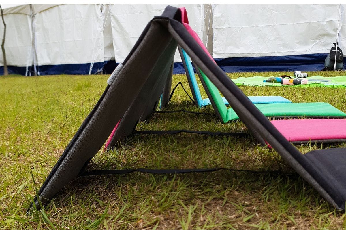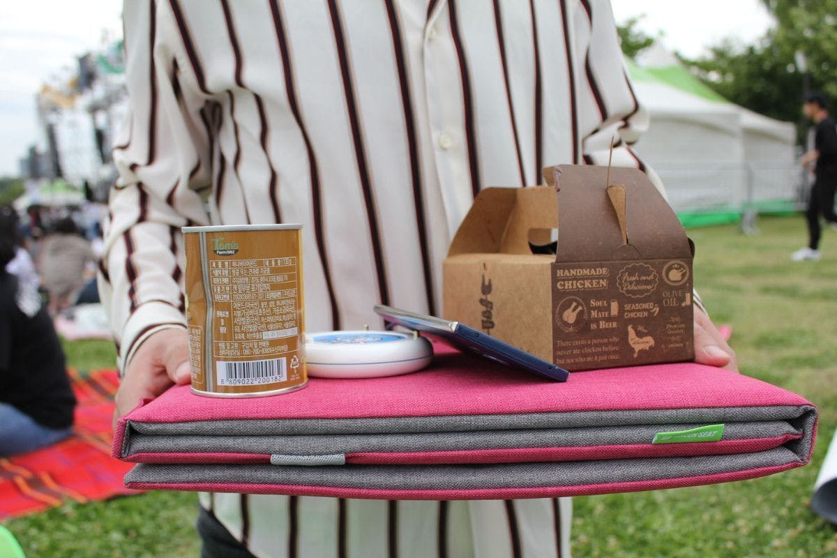 屋外アクティビティは露店、売店などで買い物をすることもありますよね。そんな時はヒューシートが椅子からミニトレイとして活用ができ、大変便利です!