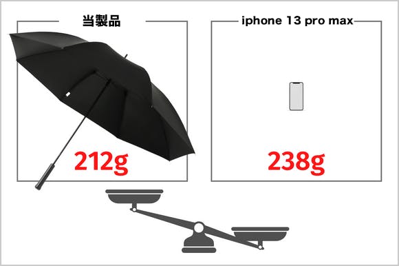 通常の長傘と比較しても212gと超軽量。フルカーボンファイバーの骨組みにすることで、傘の耐風性を保持しながらも、大幅な軽量化を実現しました。