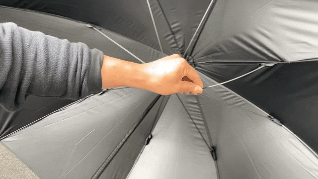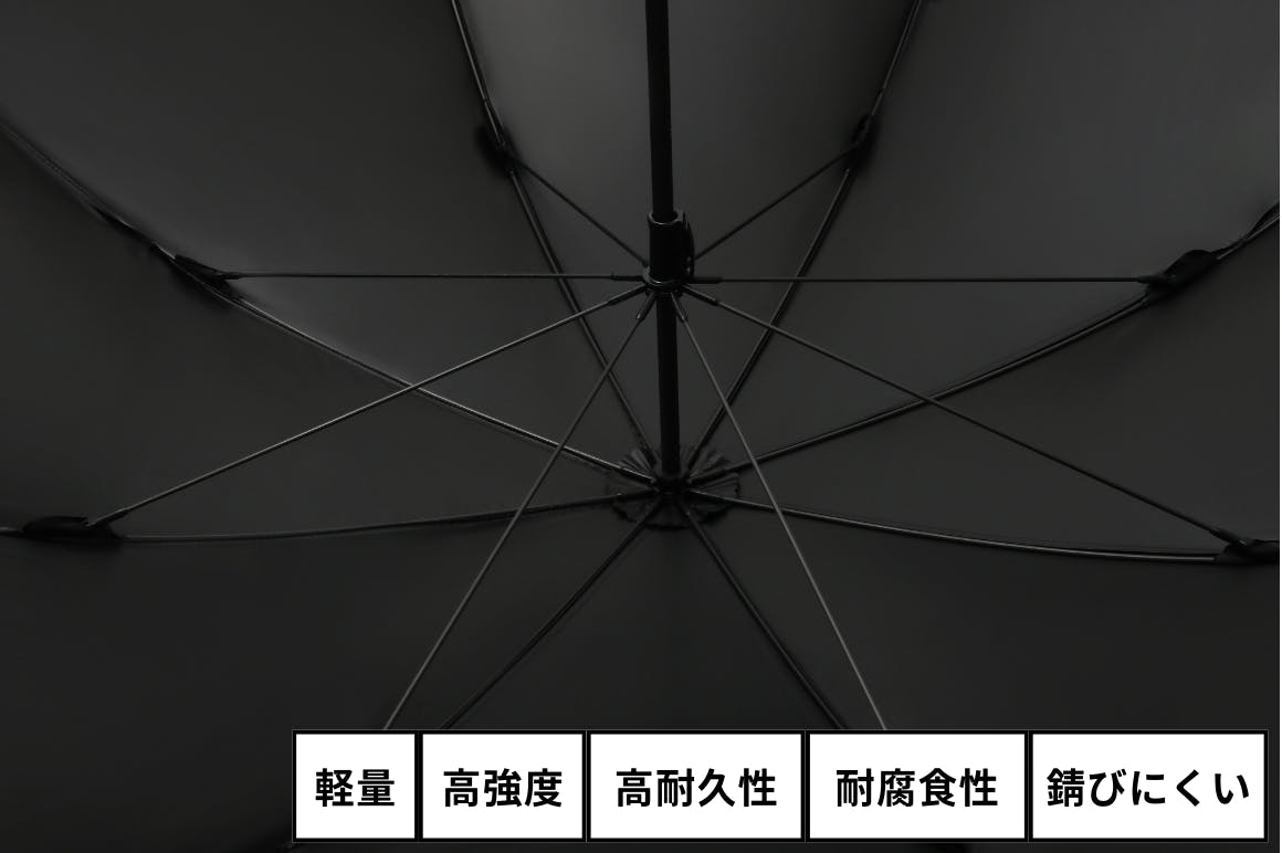 親骨から中棒(シャフト)まで、傘の耐風性に関わる部分がフルカーボンファイバーとなっています。航空機などにも使われる高級素材のカーボンファイバーを使用することで、軽さと強さを両立しています。