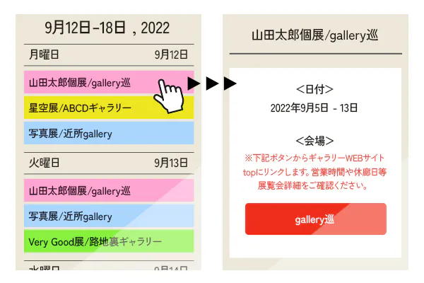 「今日は○○駅周辺に行く予定があるから、そのエリアで開催中の展示をついでに見ていきたい!」「お目当ての作家さんの展示を観てから、その近所にあるギャラリーも巡りたい!」といった際に、このカレンダーページにアクセスすれば、一目で欲しい情報をゲットできます。