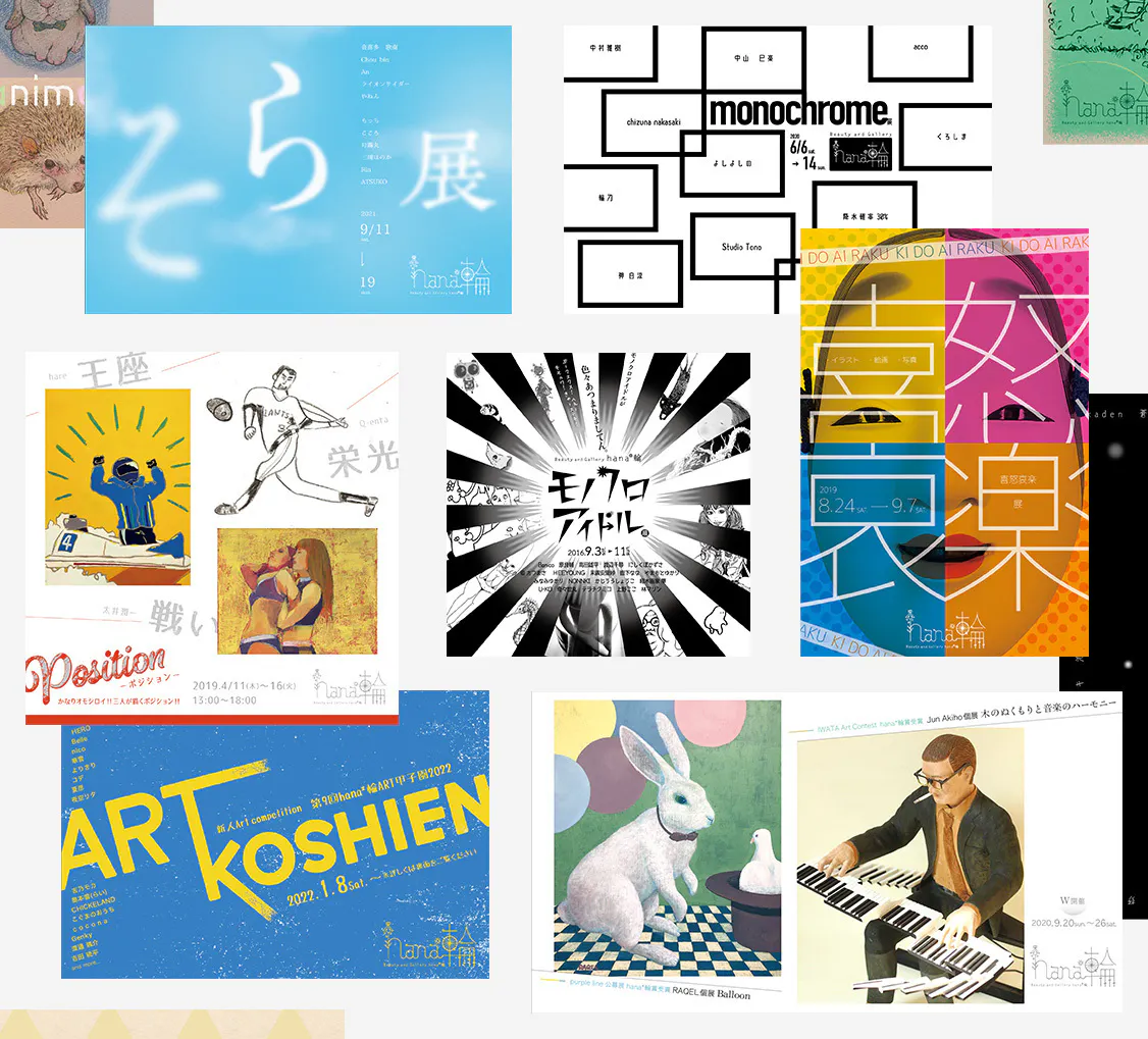 アートに関わる仕事としては、大阪市平野区にある「Gallery hana輪」さんのWEBサイト作成、また、2014年ごろからhana輪で開催される多くの展示のDMやフライヤーのデザインを担当しています。