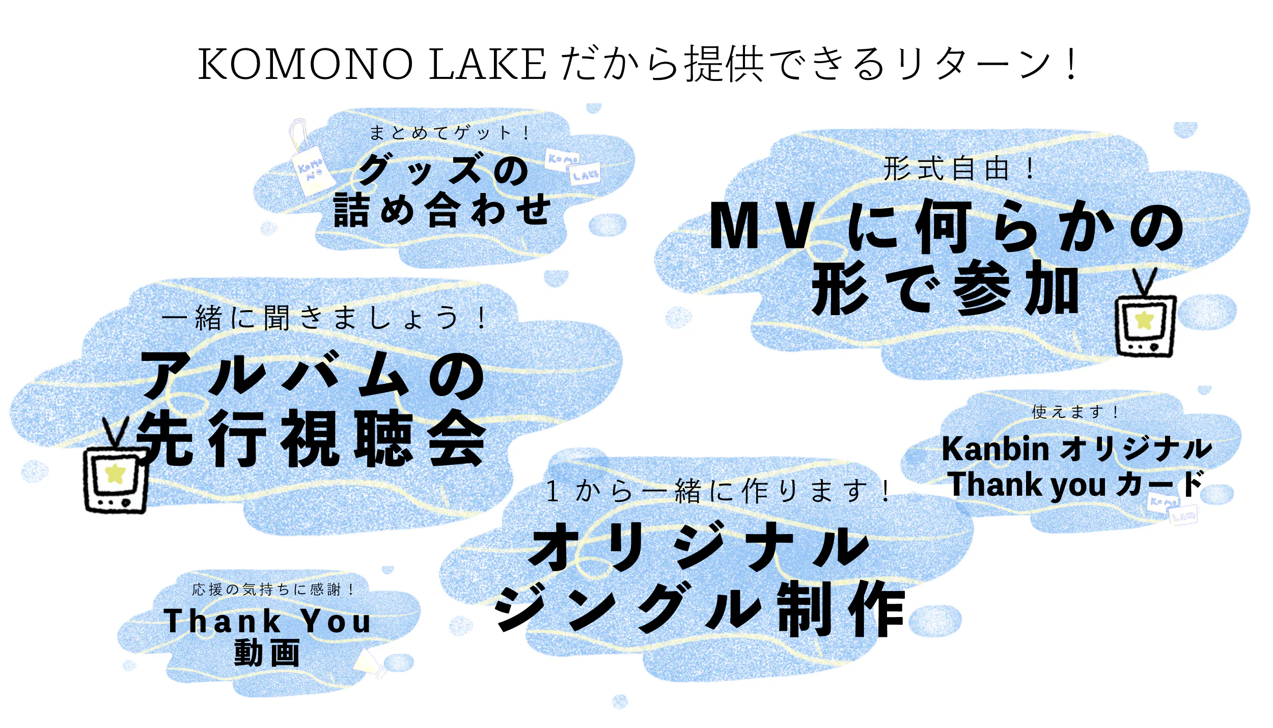 MV出演(色々な形式あり!)、ジングル制作(1から一緒に!)など、どうやって進めるの?と思われる方も多いと思いますので、詳しくはそれぞれのリターンの詳細をぜひご覧ください!