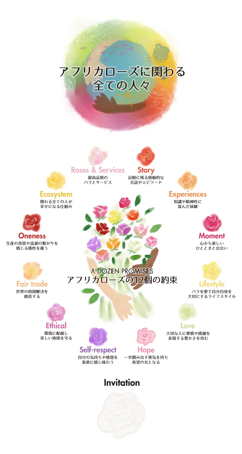 今後10年、社会においてAFRIKA ROSEはどんな存在でありたいか?に想いを馳せた時、『未来へのバトン』というキーワードが浮かんできました。未来を担う子供たちの豊かな心を育むこと、孫やその先の子孫が住み続ける地球環境を守ること、そして自分自身の幸せな未来を愛でること。