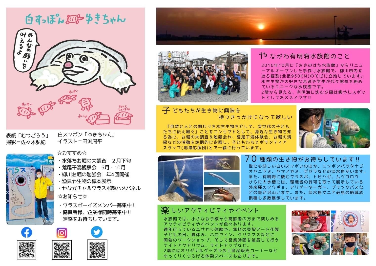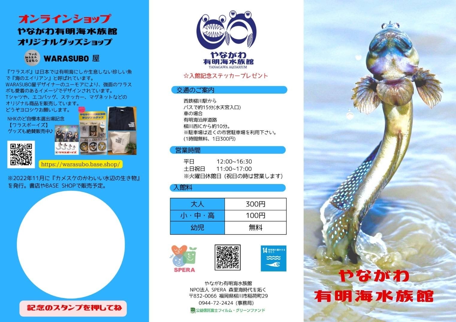 ※水族館では、子ども向けの勉強会や、ミニマルシェ、季節に合わせたイベントなどを行っています。水族館ボランティアスタッフ【ワラスボーイズ】を中心に、子どもたちに生き物に興味を持って、生き物の存在を知ってもらう事で、自然や環境に対する事、今自分が出来る事を自ら考え、少しずつ動き出すきっかけ作りをしたいと日々活動しています。是非やながわ有明海水族館に来て下さい‼︎