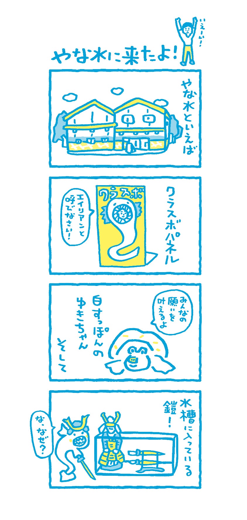 【やな水に来たよ!】さてさて、やながわ有明海水族館って、いったいどんな所なんでしょうね?マンガを読むと、ちょっと不思議な水族館と言うのが伝わりますよね(笑)水族館の水槽に何故だか『鎧』や『刀』が鎮座しています。どうして?って思うけど、ちゃんとした理由があるのです……