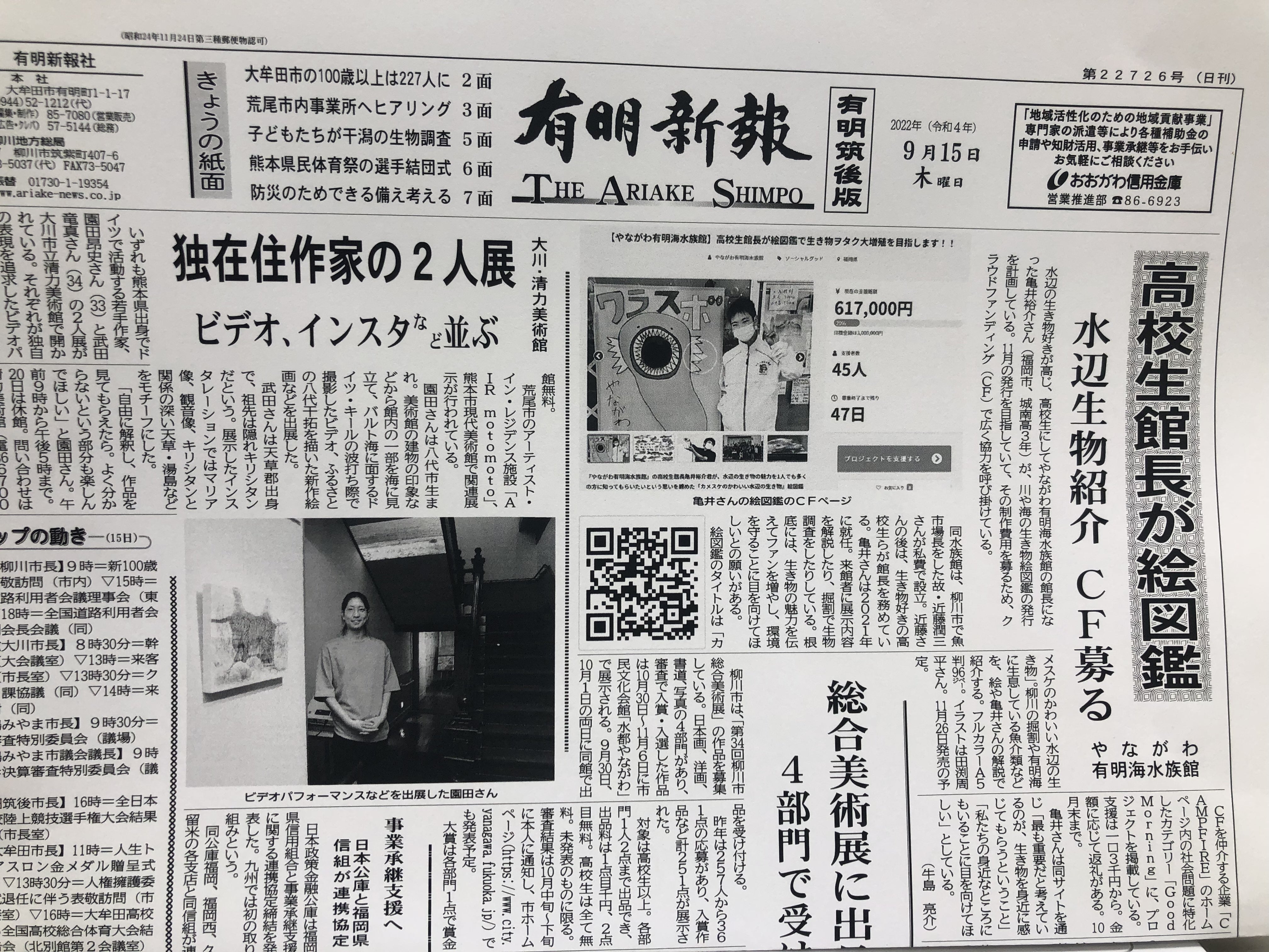 地元新聞の『有明新報』有明筑後版1面トップ記事として、亀井館長の絵図鑑発行の事、クラウドファンディングにチャレンジしている事を取り上げて頂きました。ありがとうございます‼︎