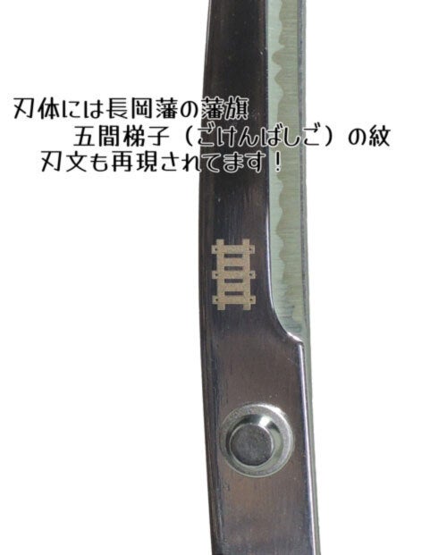 また、刃本体には日本刀らしく波紋はもちろん、ネジ付近には継之助が家老を務めていた越後長岡藩の藩旗五間梯子(ごけんばしご)の紋も再現されております。