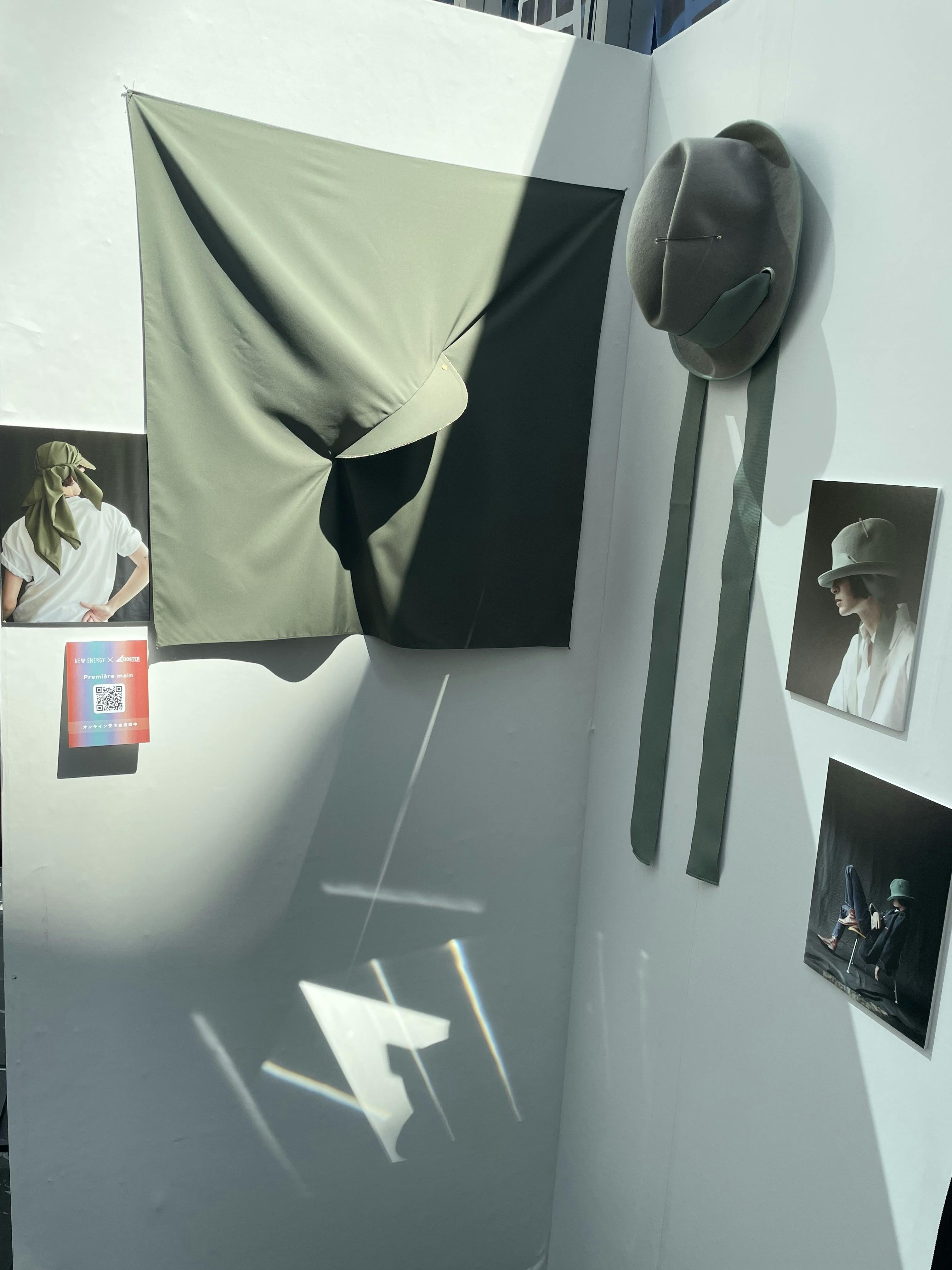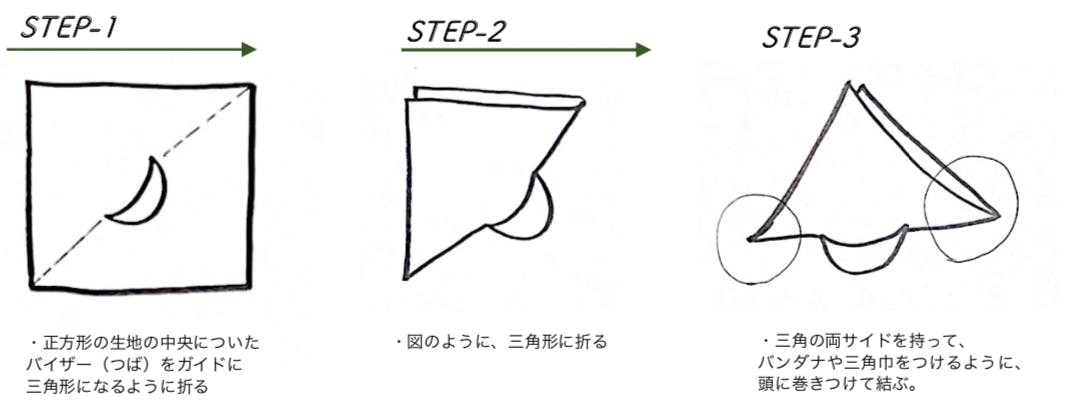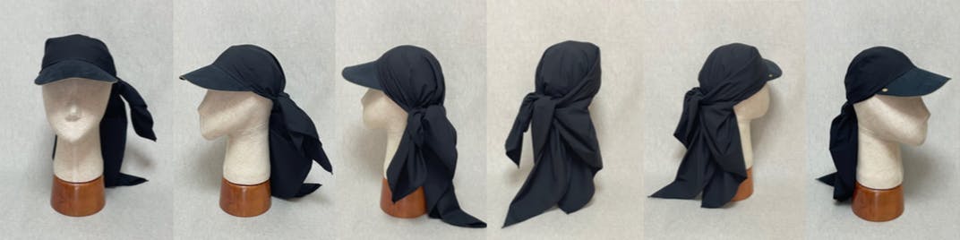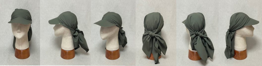 そのリクエストを受けて、今年の春の展示会でお客様にご提案したところ頭に結びつけて着用する新しいキャップスタイルは、期間中にお客様との会話で様々な着用方法や着用シーンのアイディアが発見され、じわりじわりと話題になりました。