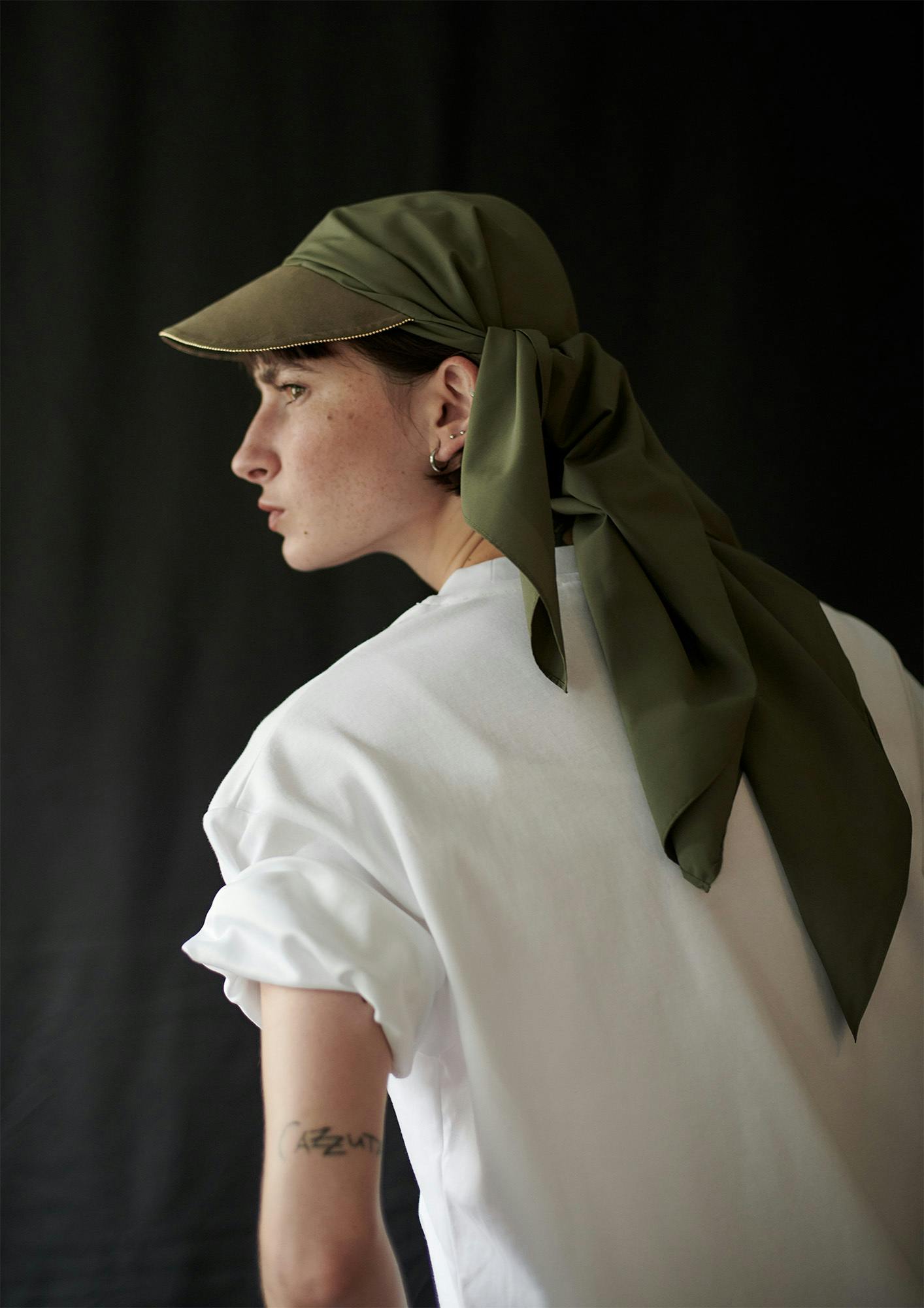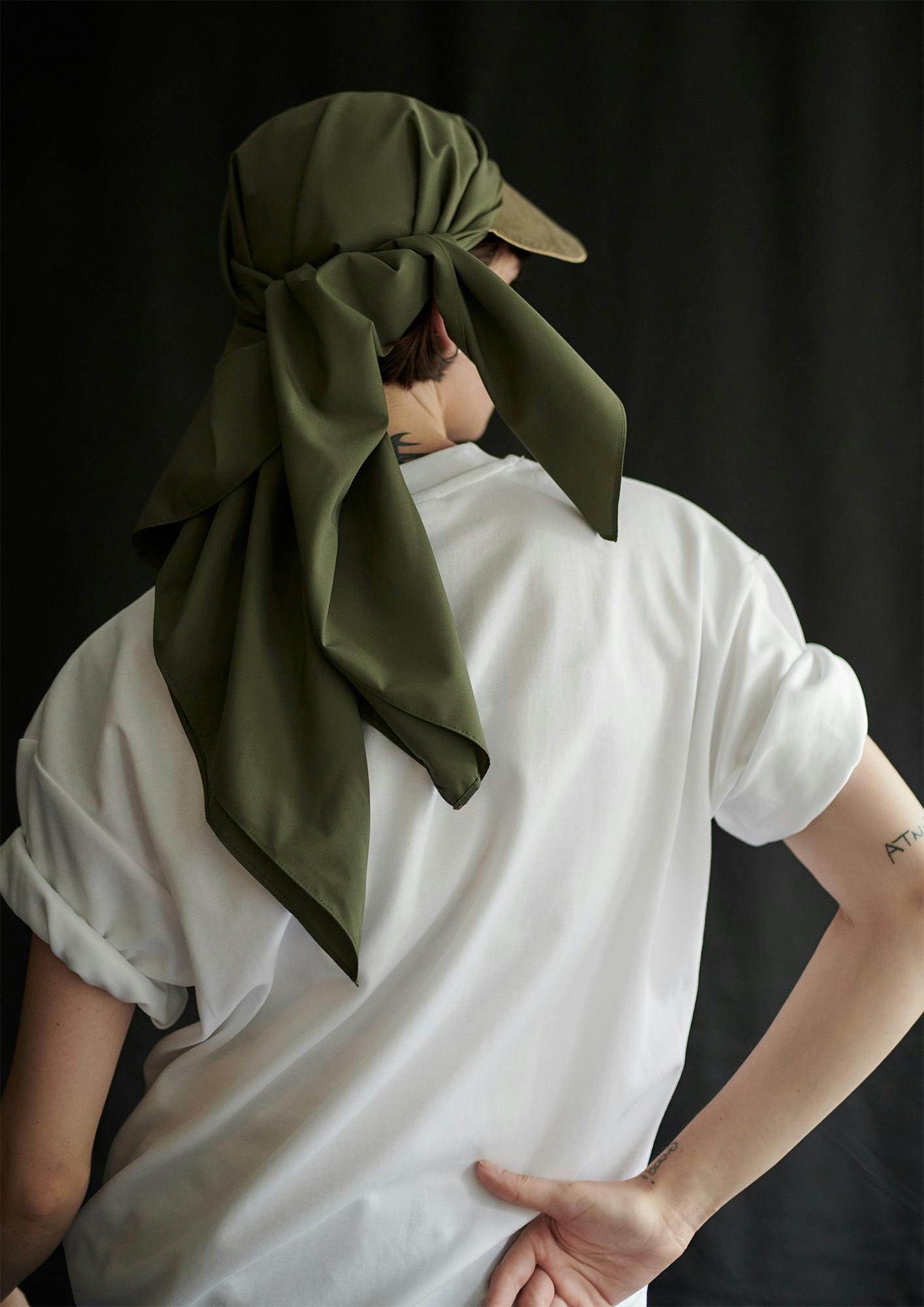 このスカーフキャップは、今までの帽子の概念の真逆の構造である平らな一枚の布で出来ています。そして「結ぶ」というアクションによって、自然な布の流れのドレープが生まれ、帽子のかたちへと変化するのが最大の特徴です。